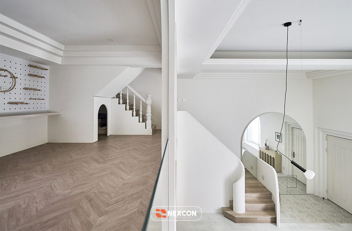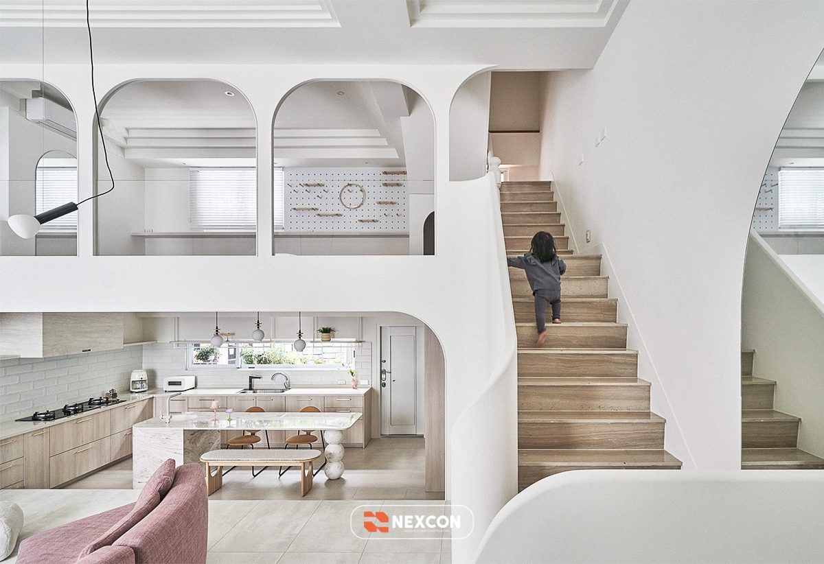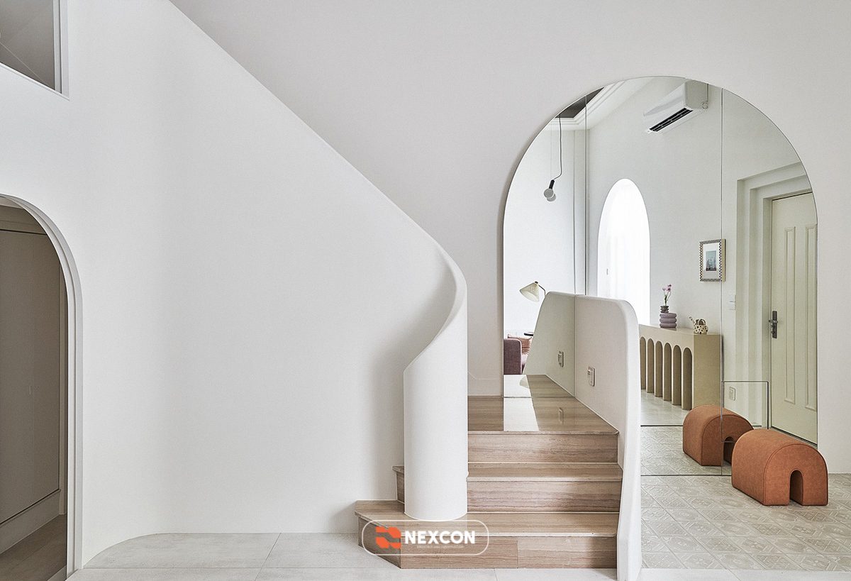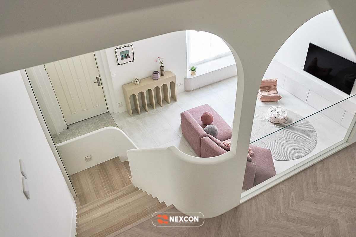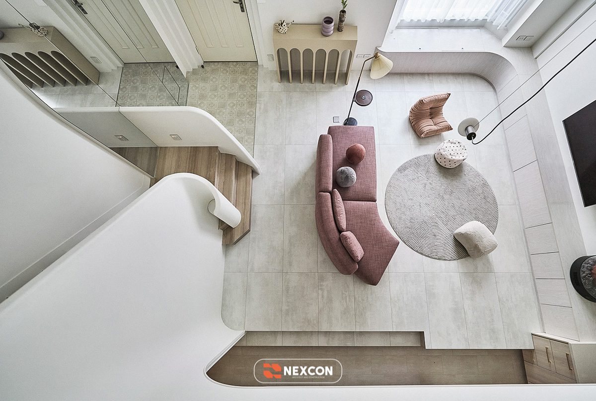 Công trình tận dụng thông tầng, tổ chức lại giao thông đứng bằng cầu thang bo cong, kết hợp nội thất thấp và linh hoạt. Các khu vực chức năng được phân định bằng cao độ, vật liệu và ánh sáng thay vì tường ngăn cứng, giúp không gian vừa mở vừa có chiều sâu.