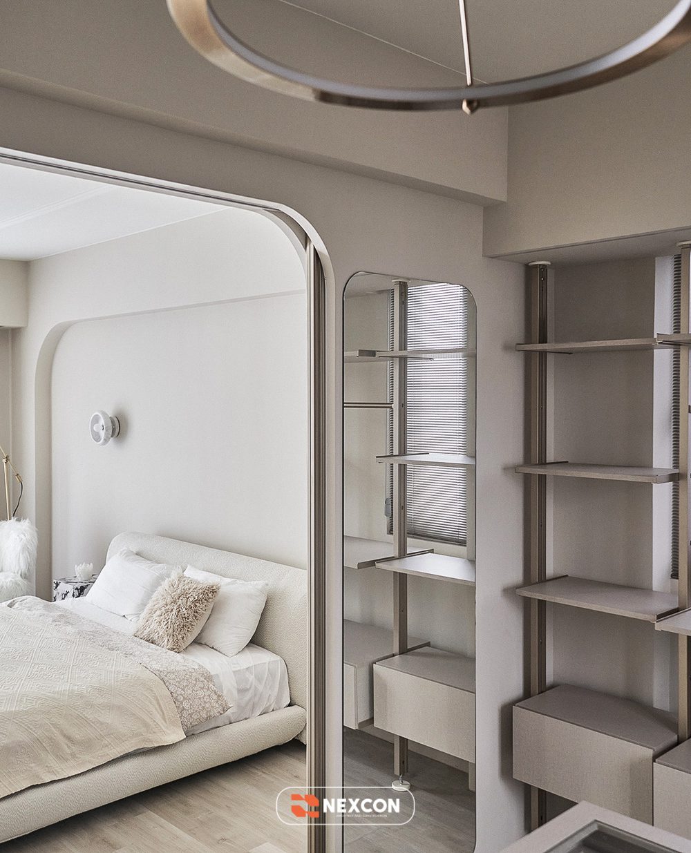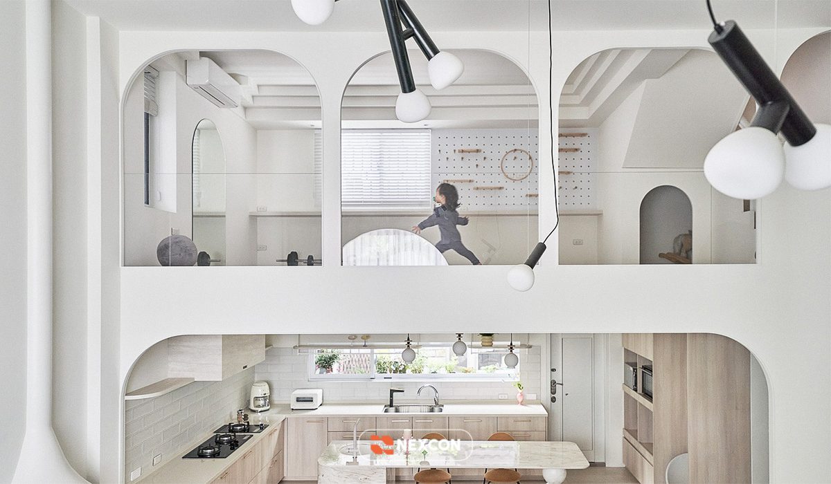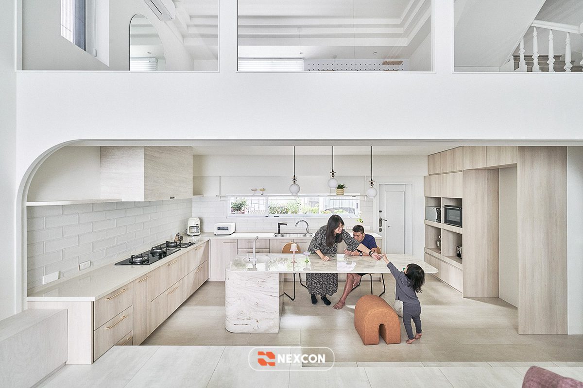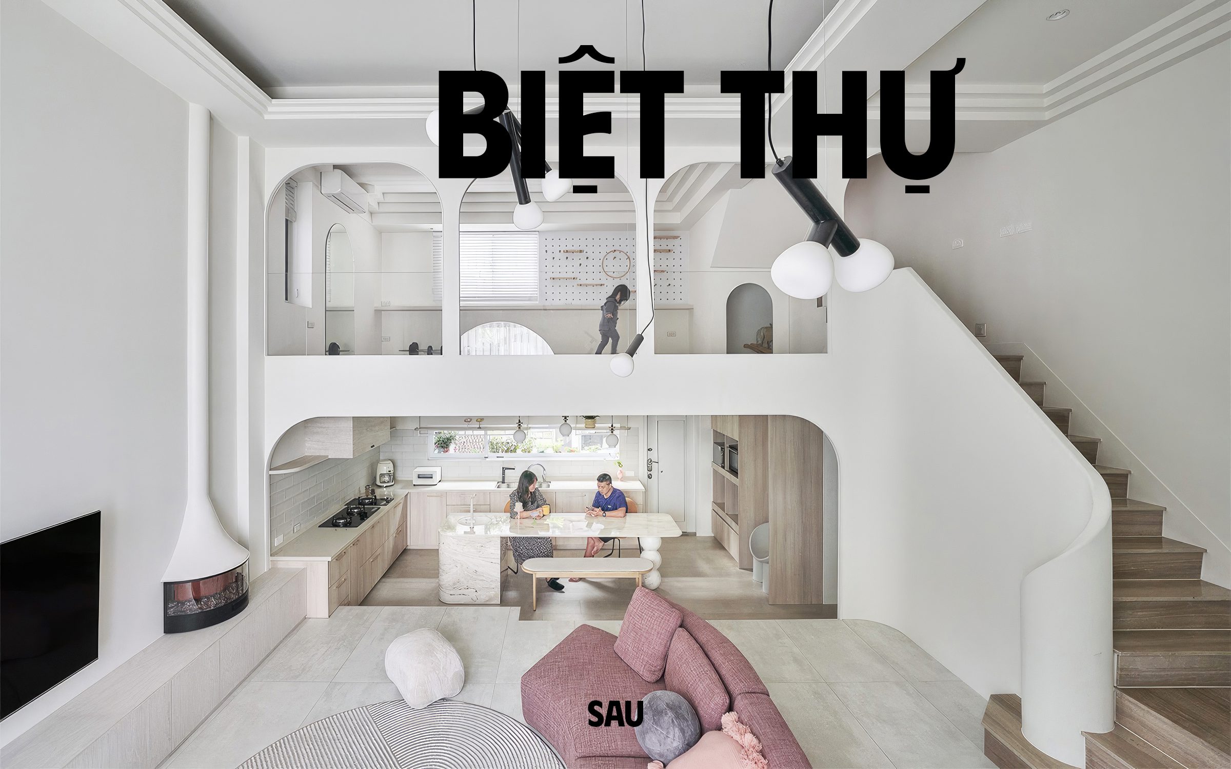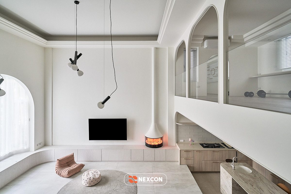 Công trình tận dụng thông tầng, tổ chức lại giao thông đứng bằng cầu thang bo cong, kết hợp nội thất thấp và linh hoạt. Các khu vực chức năng được phân định bằng cao độ, vật liệu và ánh sáng thay vì tường ngăn cứng, giúp không gian vừa mở vừa có chiều sâu.