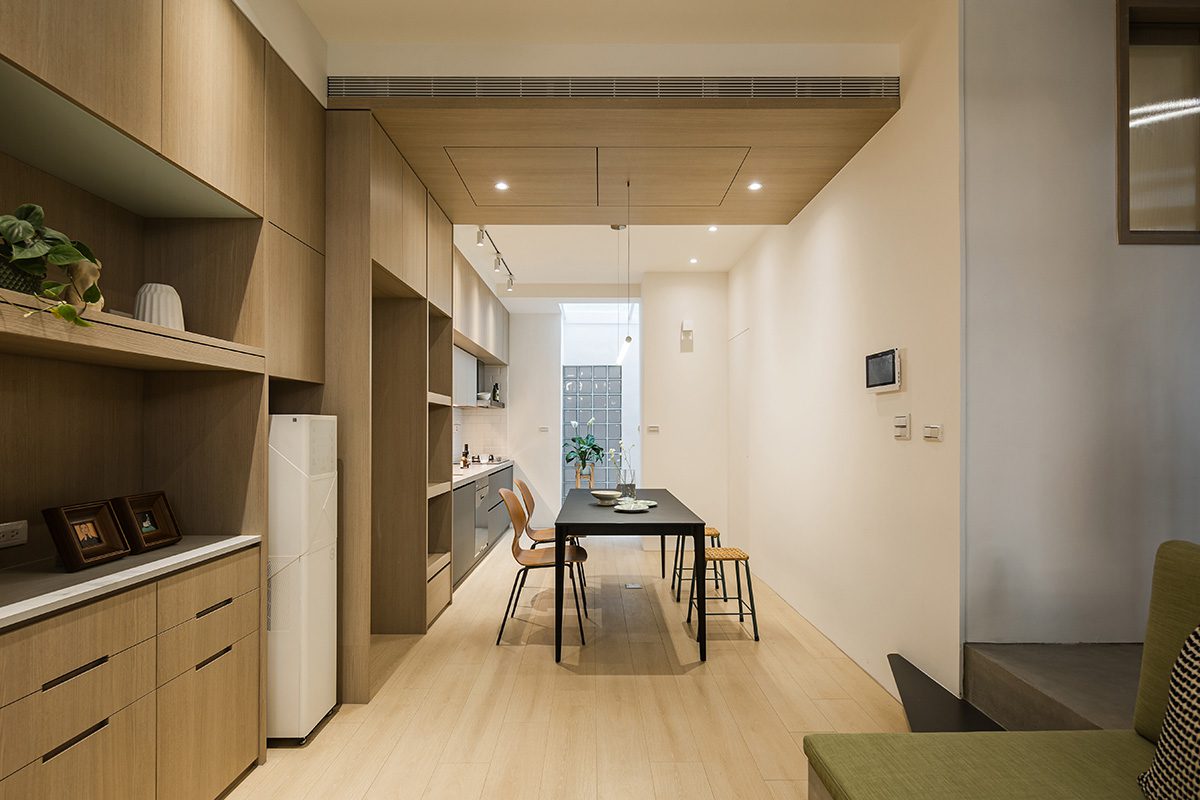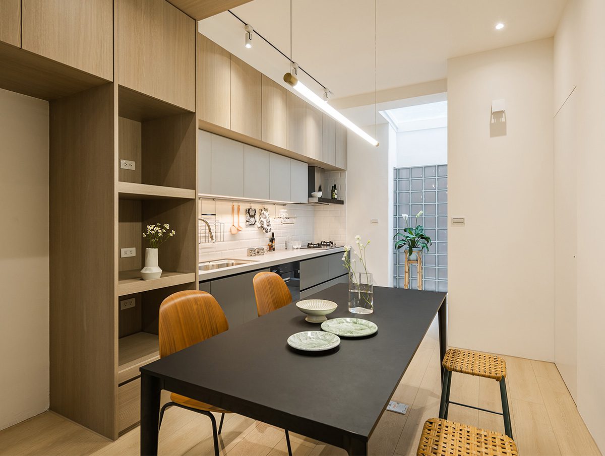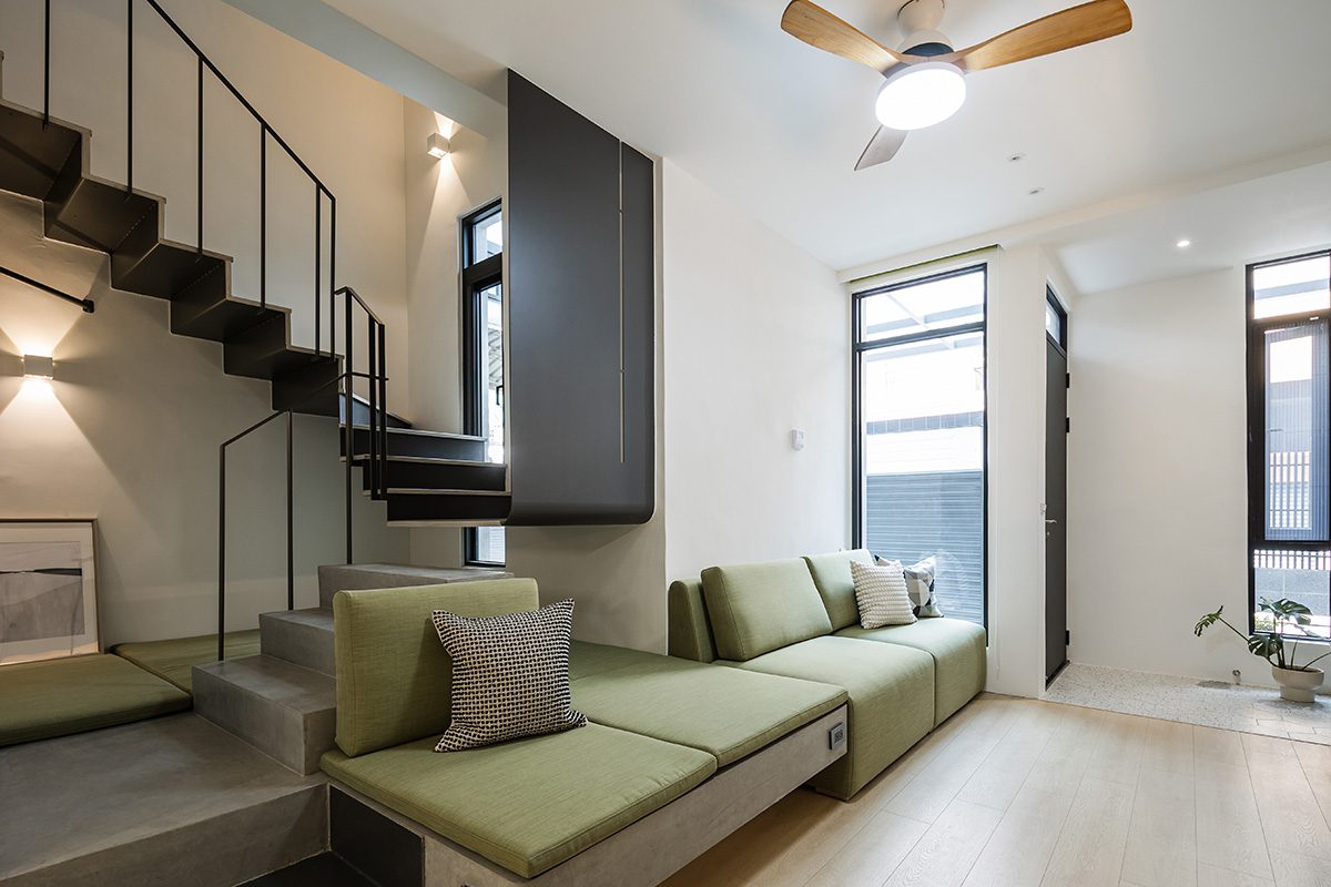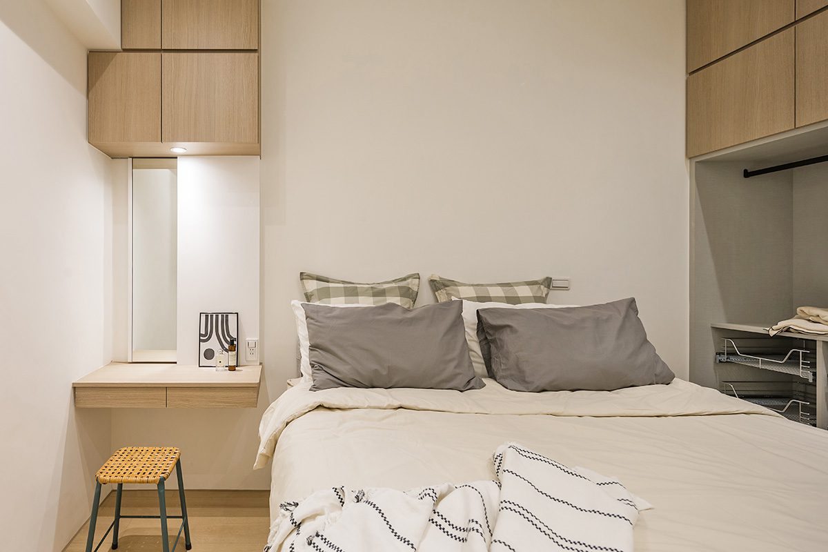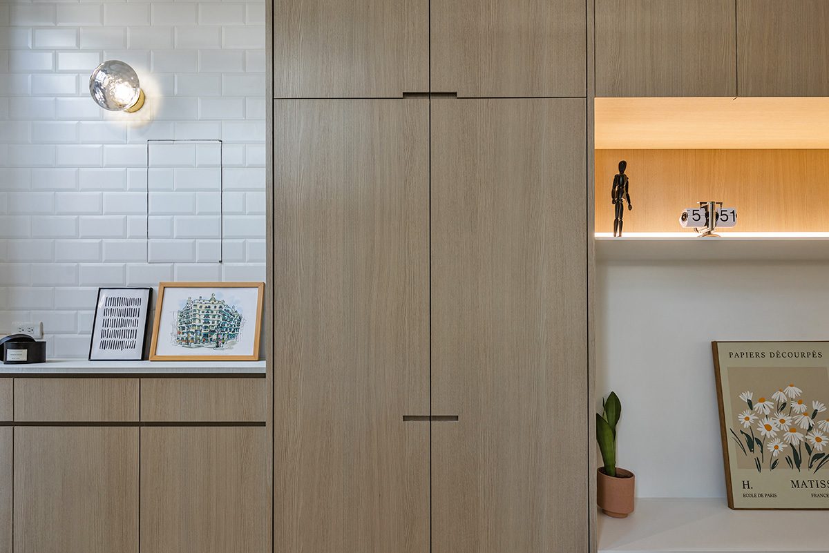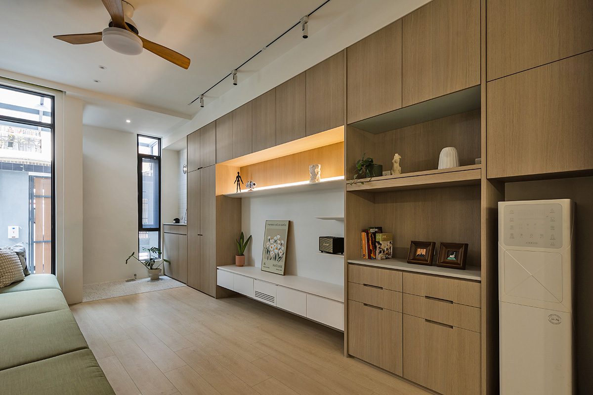 Hệ tủ âm tường và nội thất đa năng giúp căn hộ luôn gọn gàng. Khu sinh hoạt chung được mở rộng nhờ hạn chế vách ngăn. Ánh sáng tự nhiên và đèn gián tiếp được kết hợp hài hòa.