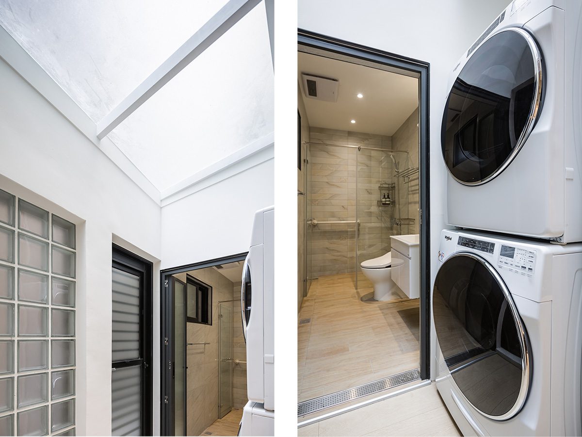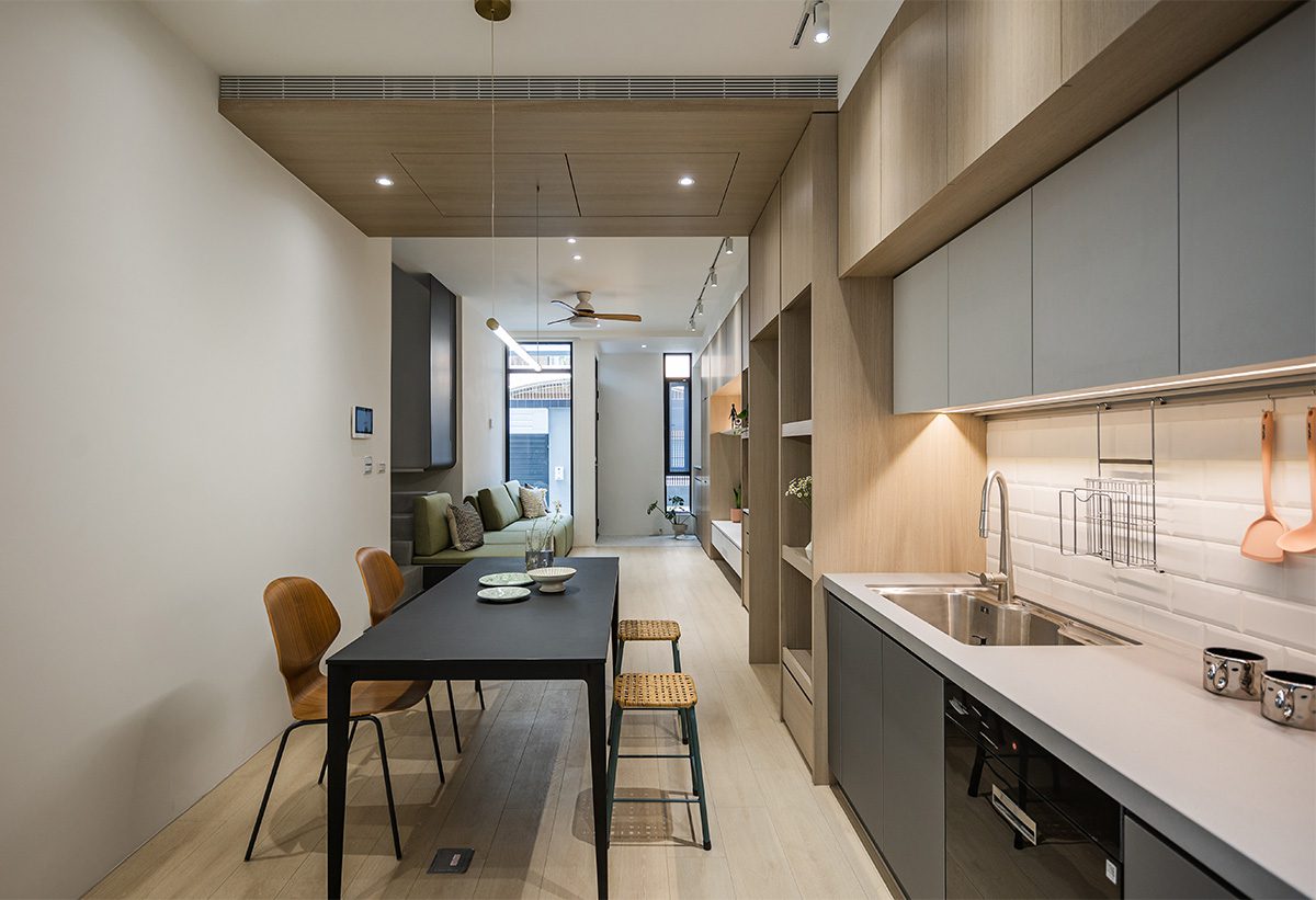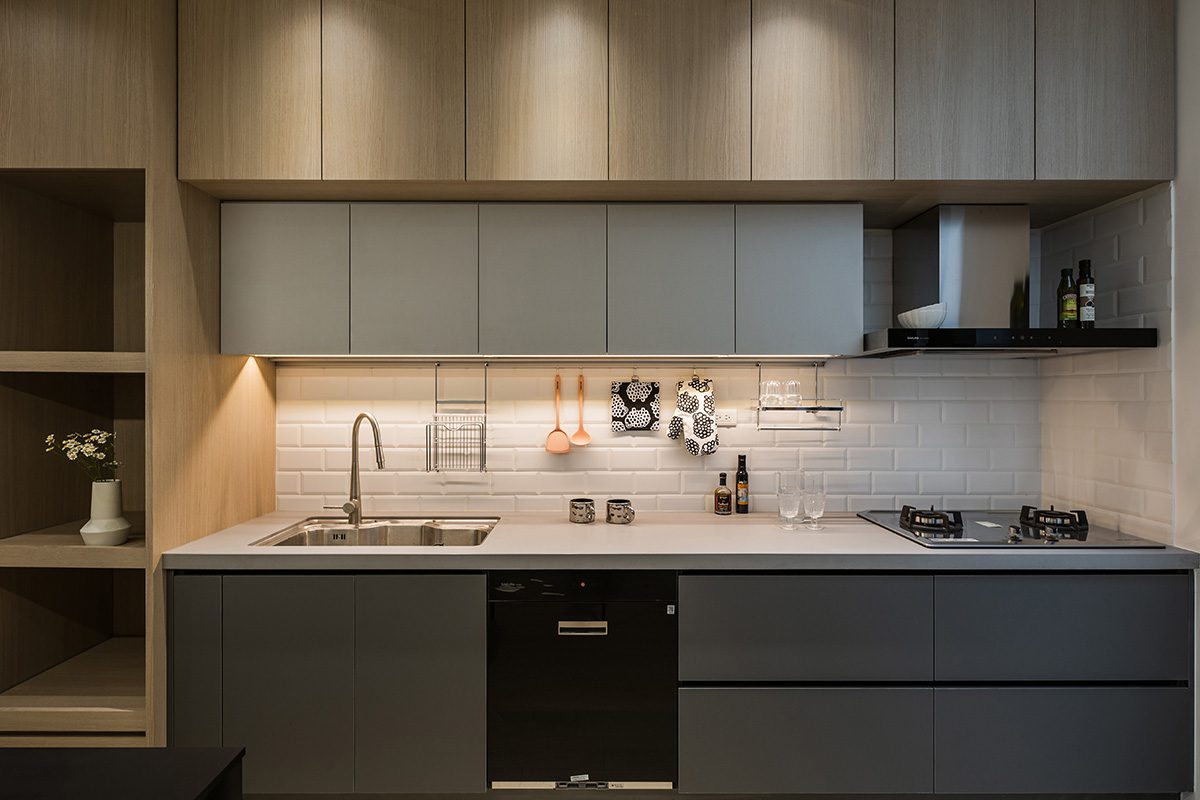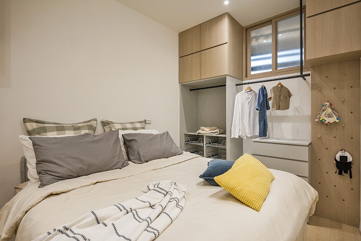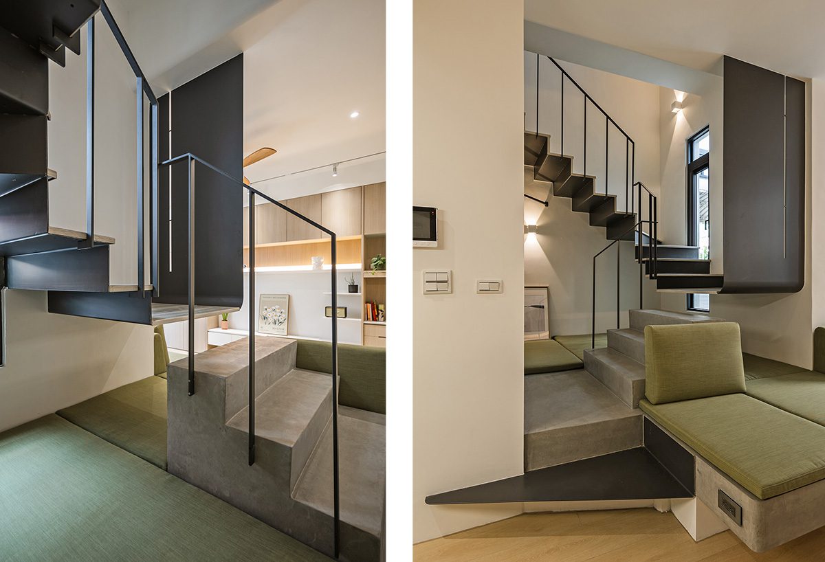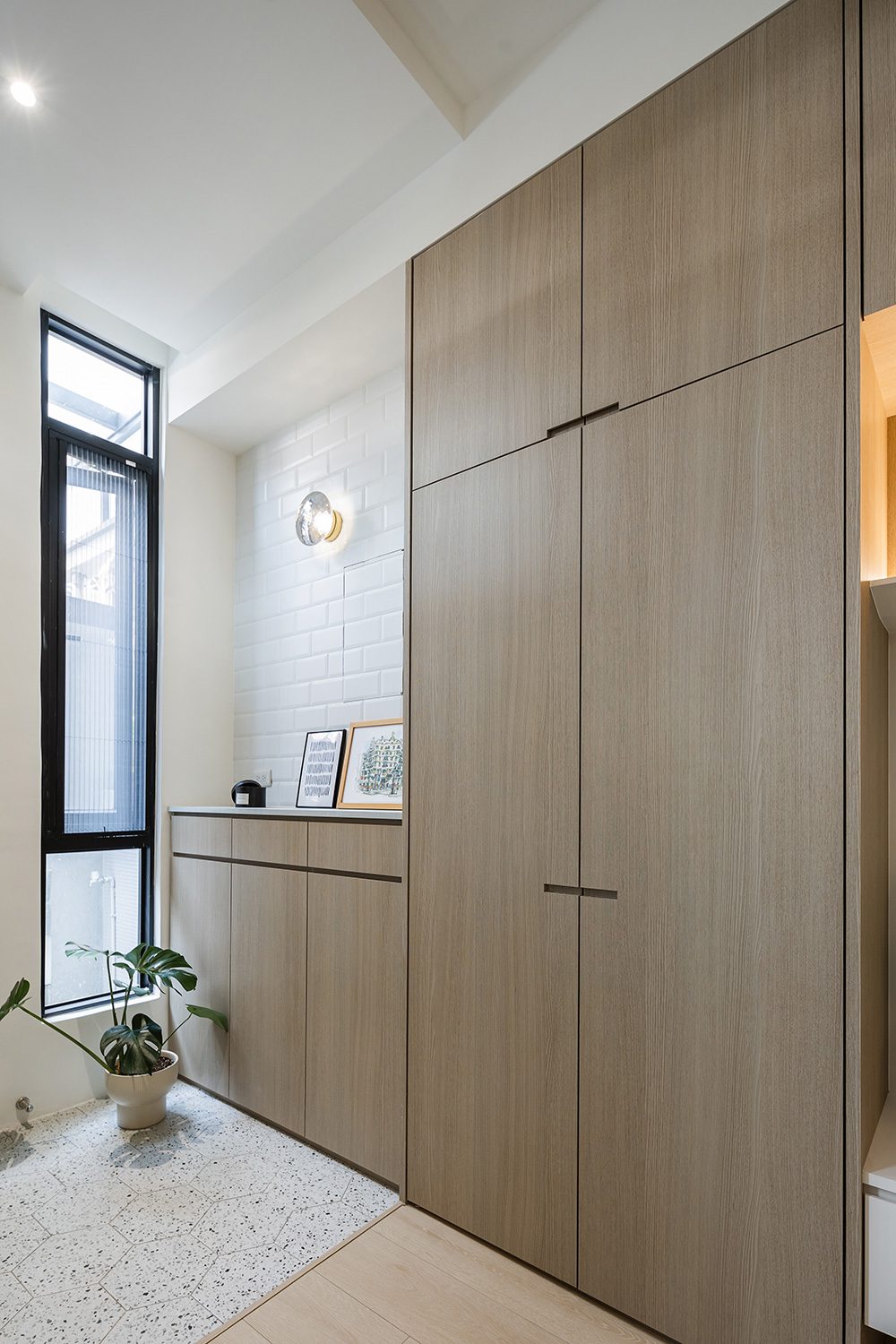 Hệ tủ âm tường và nội thất đa năng giúp căn hộ luôn gọn gàng. Khu sinh hoạt chung được mở rộng nhờ hạn chế vách ngăn. Ánh sáng tự nhiên và đèn gián tiếp được kết hợp hài hòa.