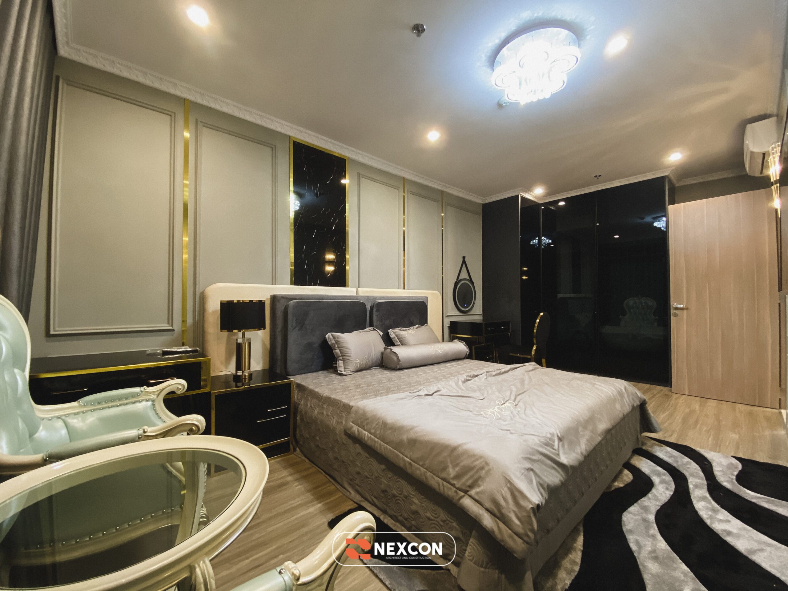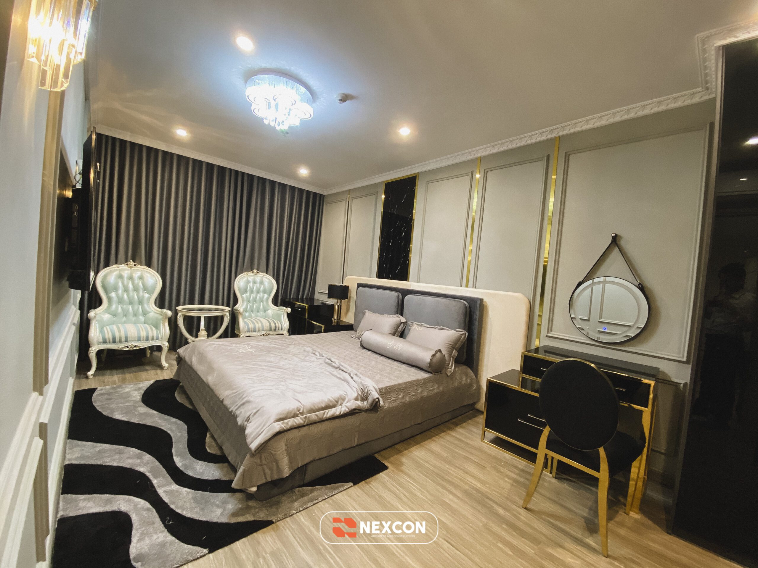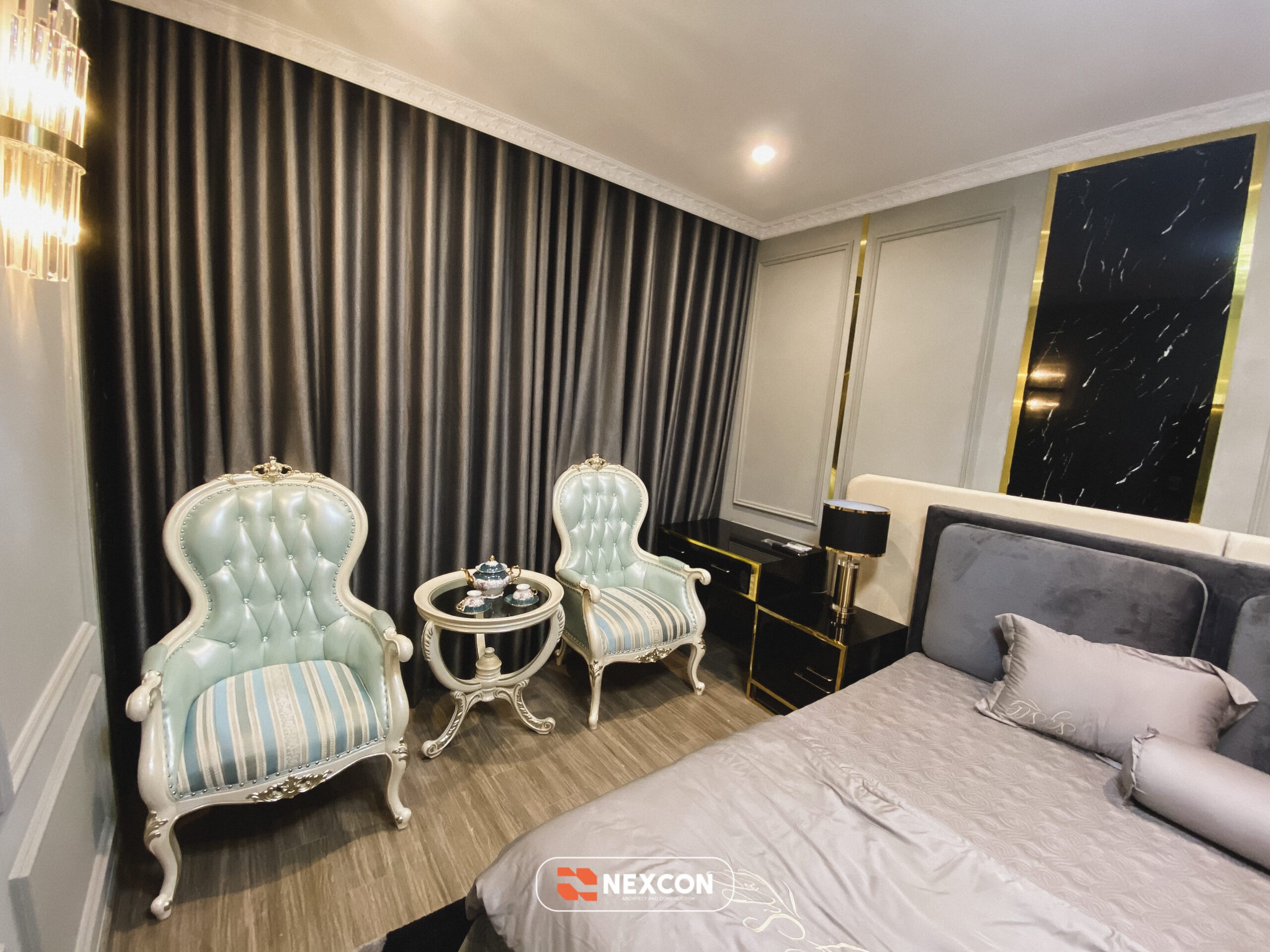 Phòng ngủ được bố trí theo trục đối xứng, giúp tổng thể cân bằng và hài hòa. Khu vực nghỉ ngơi, góc thư giãn và bàn trang điểm được phân tách rõ ràng nhưng vẫn giữ sự liền mạch trong trải nghiệm sử dụng.