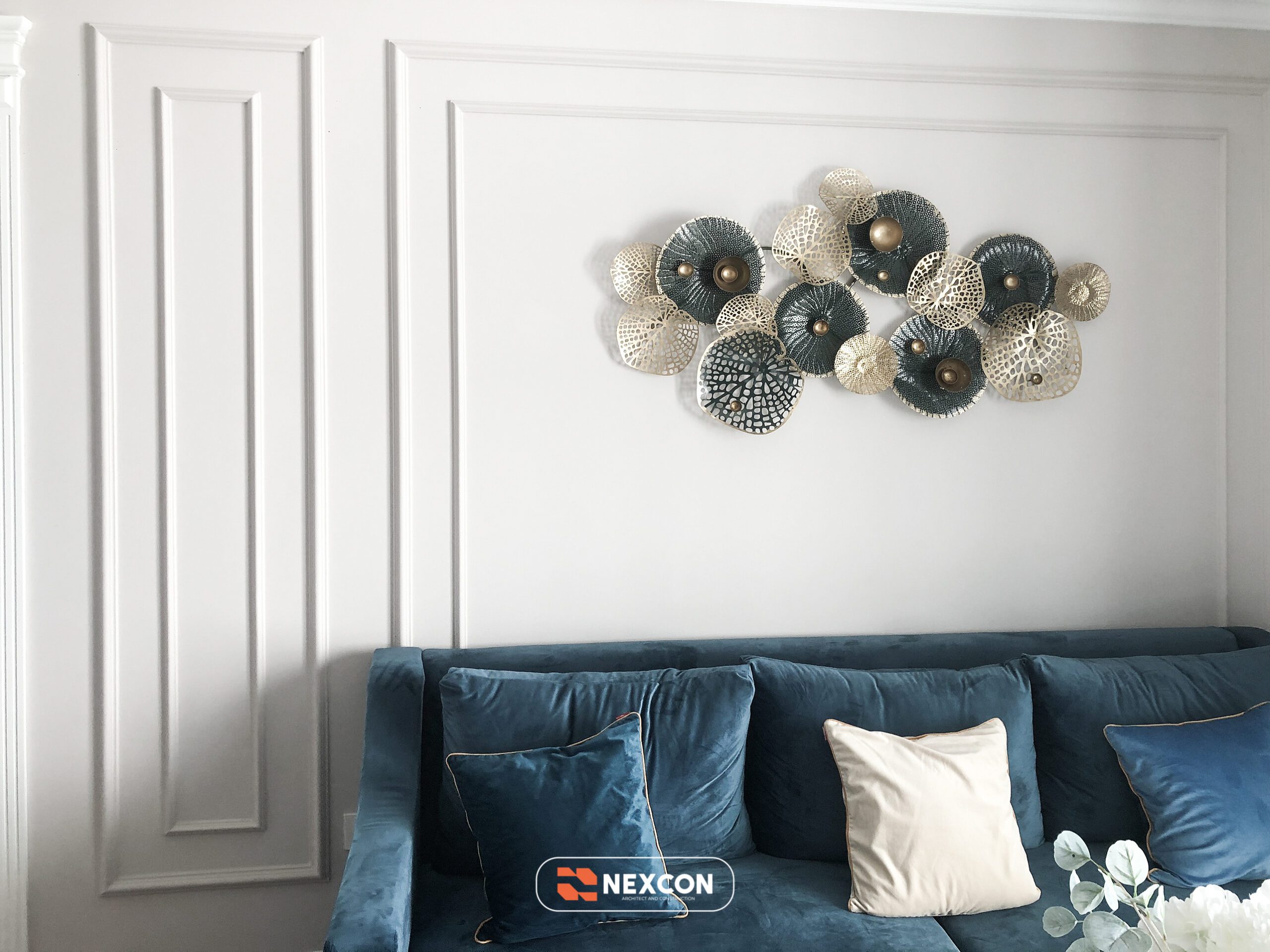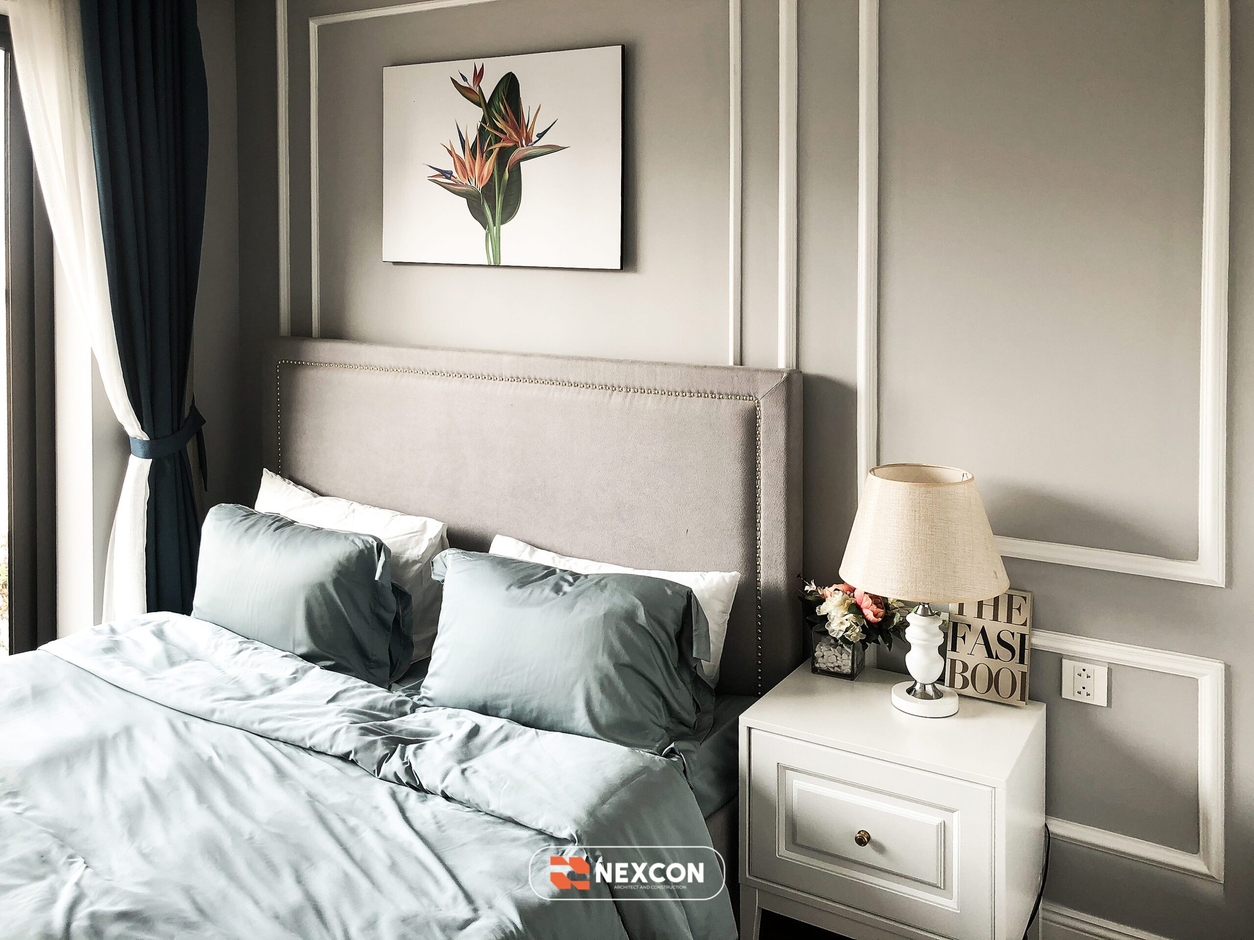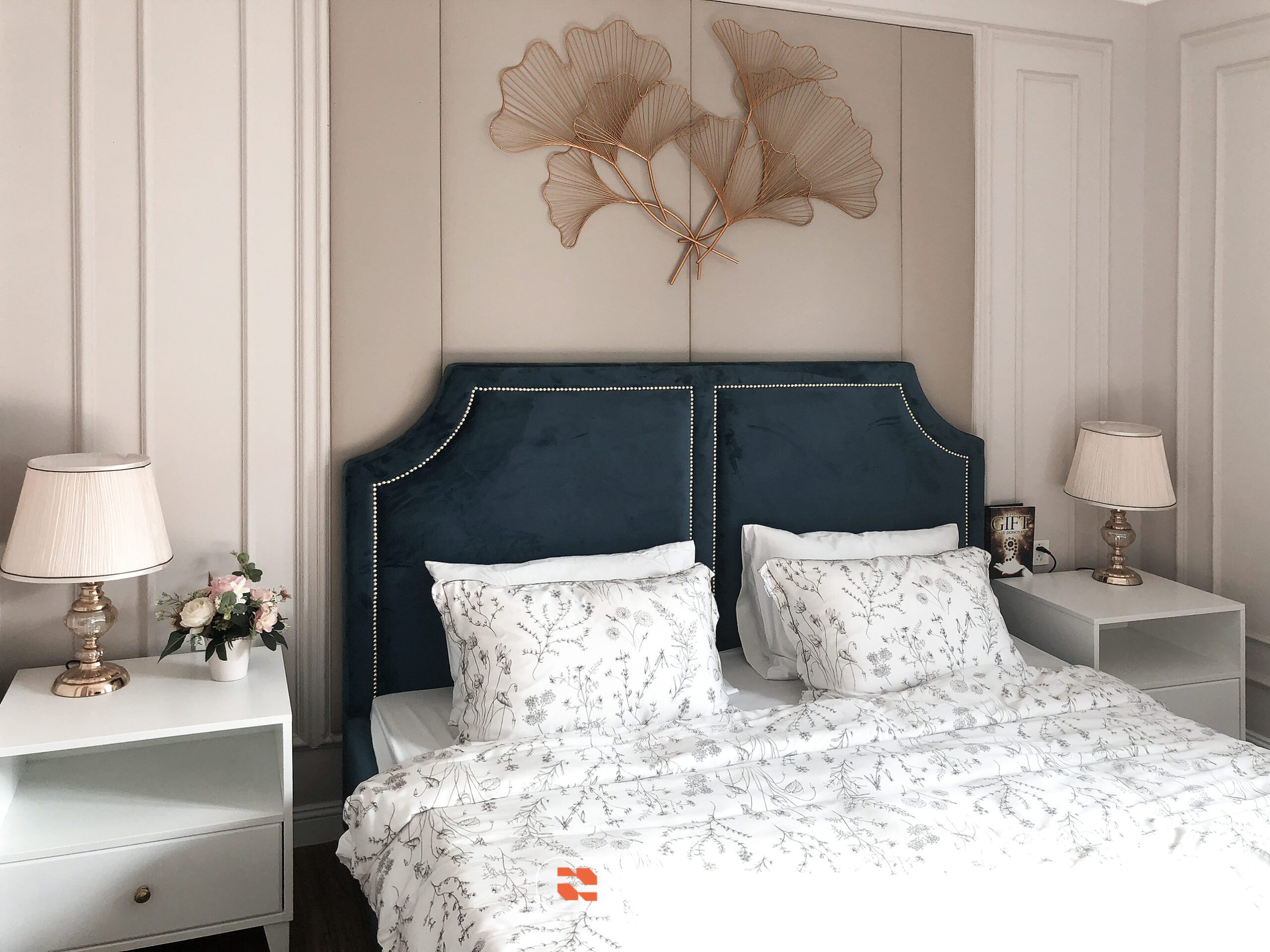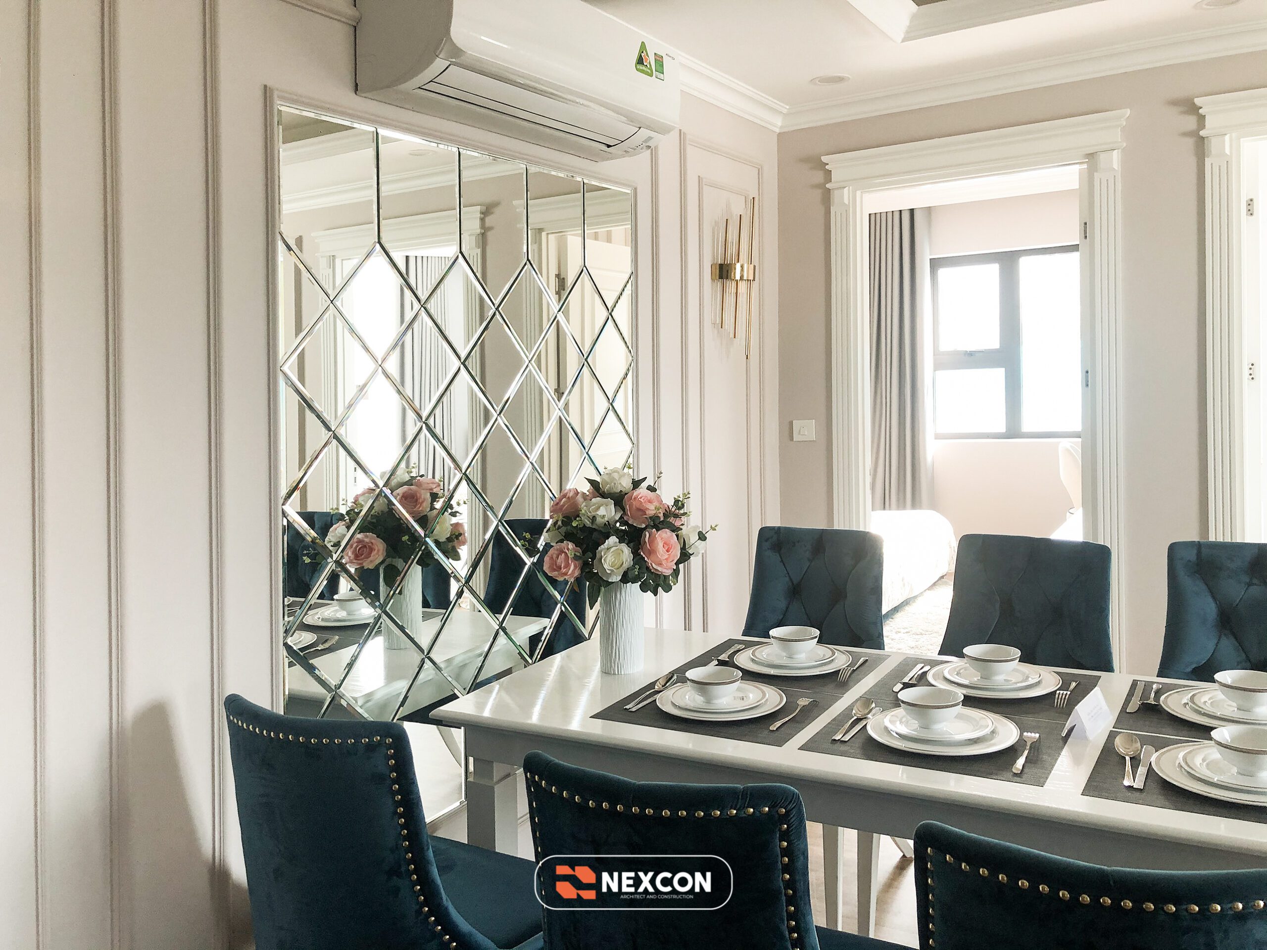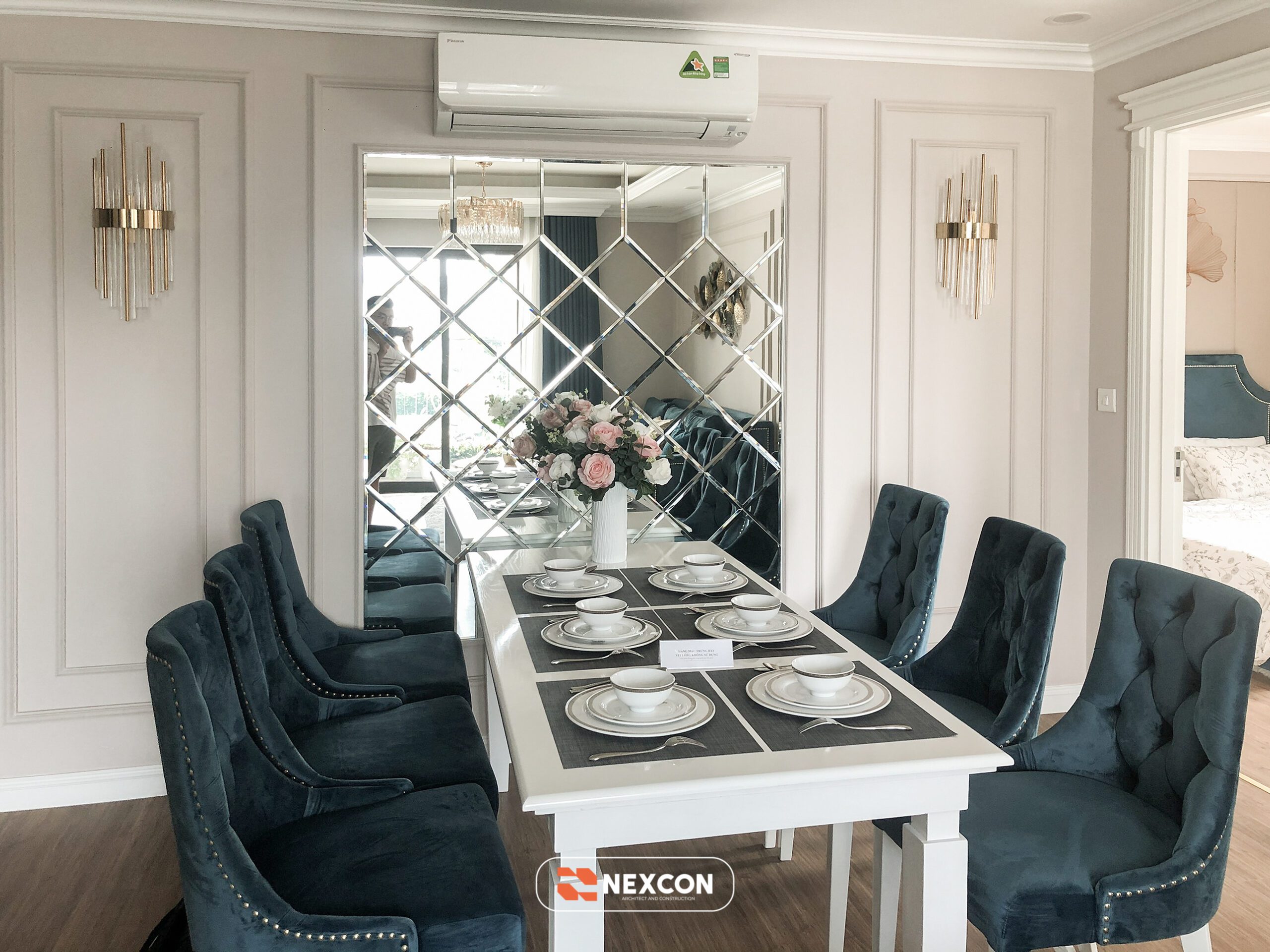 Chất liệu chủ đạo gồm gỗ sơn trắng, vải nhung, kim loại ánh vàng và đá nhân tạo cao cấp. Gam màu xanh – trắng – kem được phối hợp khéo léo, tạo nên tổng thể nhẹ nhàng nhưng vẫn đủ chiều sâu và cá tính.