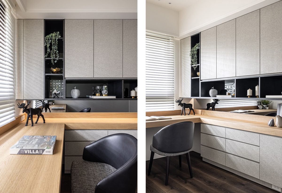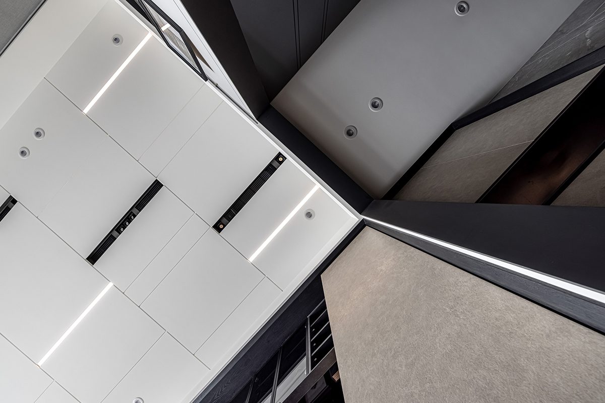 Ánh sáng tự nhiên được khai thác qua cửa sổ lớn. Rèm ngang giúp điều chỉnh ánh sáng linh hoạt. Hệ đèn tuyến tính âm trần và đèn hắt tạo hiệu ứng ánh sáng nhiều lớp.