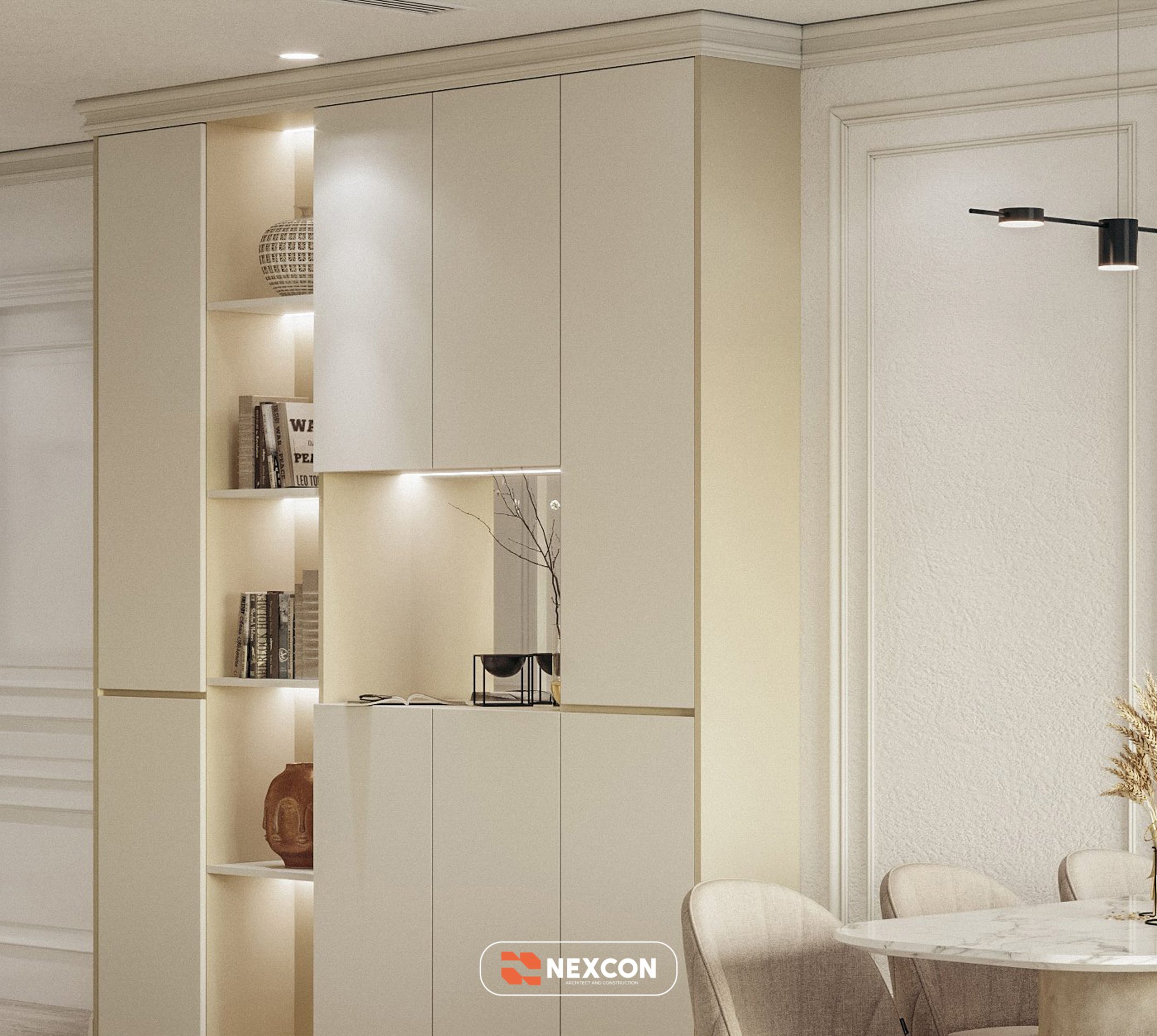 Hệ tủ cao kịch trần tận dụng tối đa chiều cao căn hộ. Tủ kính có đèn hắt tăng tính thẩm mỹ. Ngăn kéo âm giữ không gian luôn gọn gàng.
