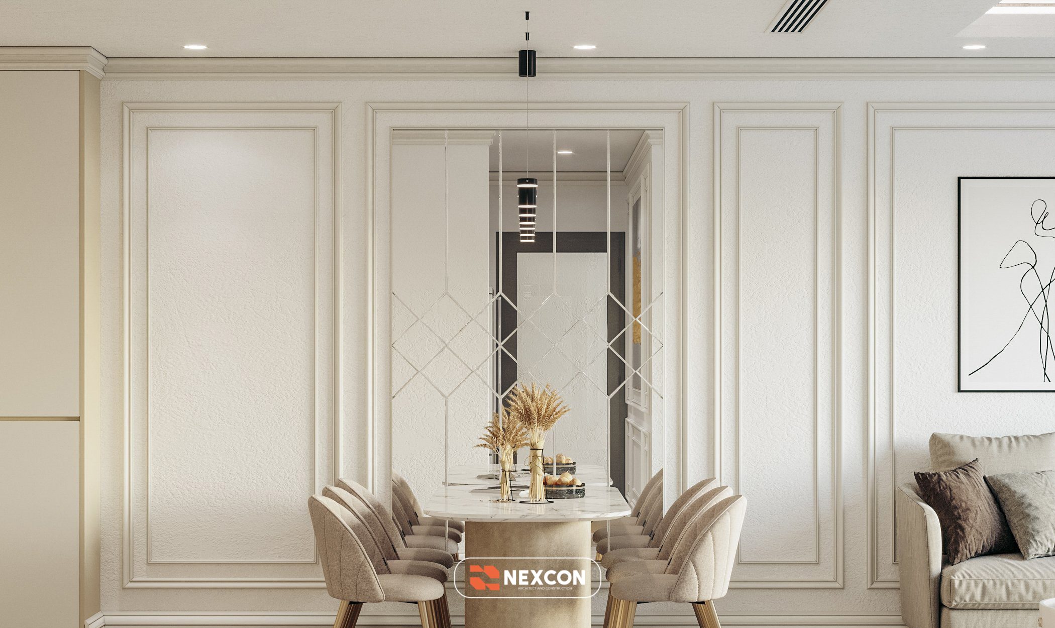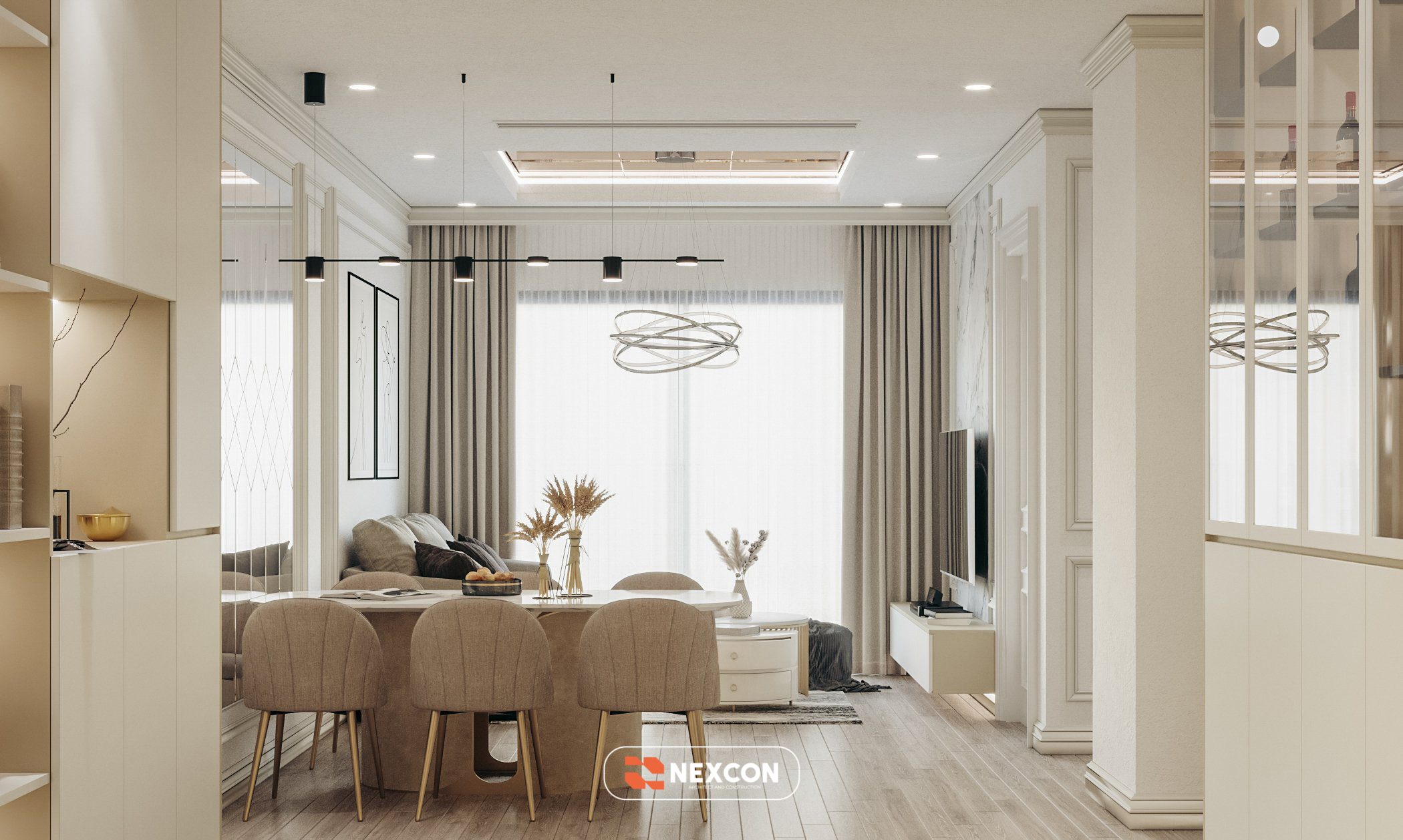 Phòng khách và khu ăn uống liên thông tạo sự liền mạch. Lối đi được mở rộng để tăng khả năng lưu thông. Vách kính trang trí giúp phân tách nhẹ nhàng giữa các khu vực.