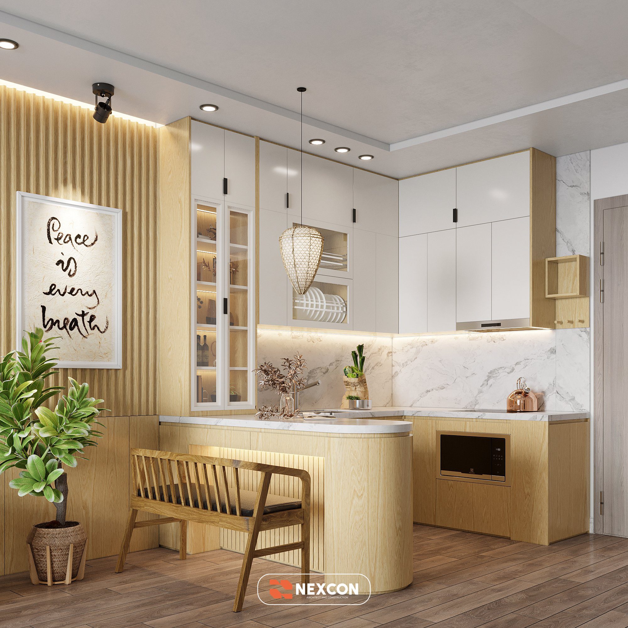Gỗ sồi sáng là vật liệu chính. Bề mặt xử lý mịn giúp tăng cảm giác tự nhiên. Tông trắng và be tạo nền trung tính. Đá marble mang lại vẻ sang trọng vừa phải.