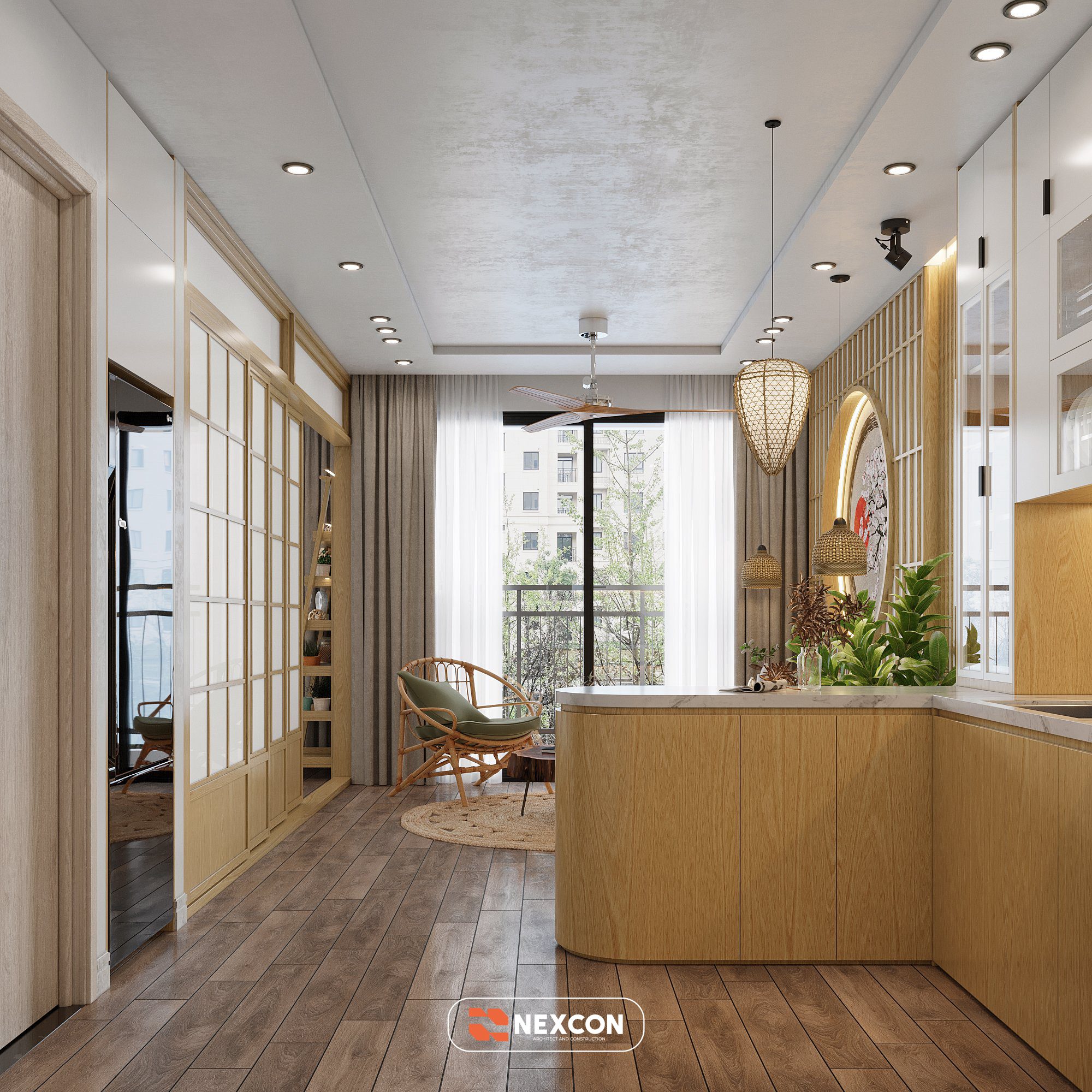 Phòng khách, bếp và khu trà được kết nối liên tục. Vách gỗ nan tạo sự phân tách nhẹ. Không gian vẫn giữ được độ mở cần thiết. Ban công trở thành góc thư giãn xanh mát.