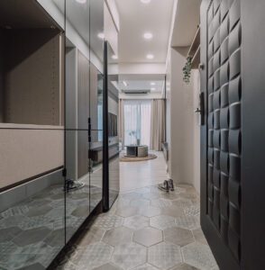 Gạch lục giác màu xám nhạt với hoa văn hình học được sử dụng để nghỉ ngơi sau khi trở về nhà sau một ngày chạy nhảy. Một bên được trang bị tủ quần áo điện tử có thể khử trùng ,khử mùi,tiệt trùng.Mặt còn lại trang trí vạch chia và có thêm kệ để mèo nhảy tùy thích.