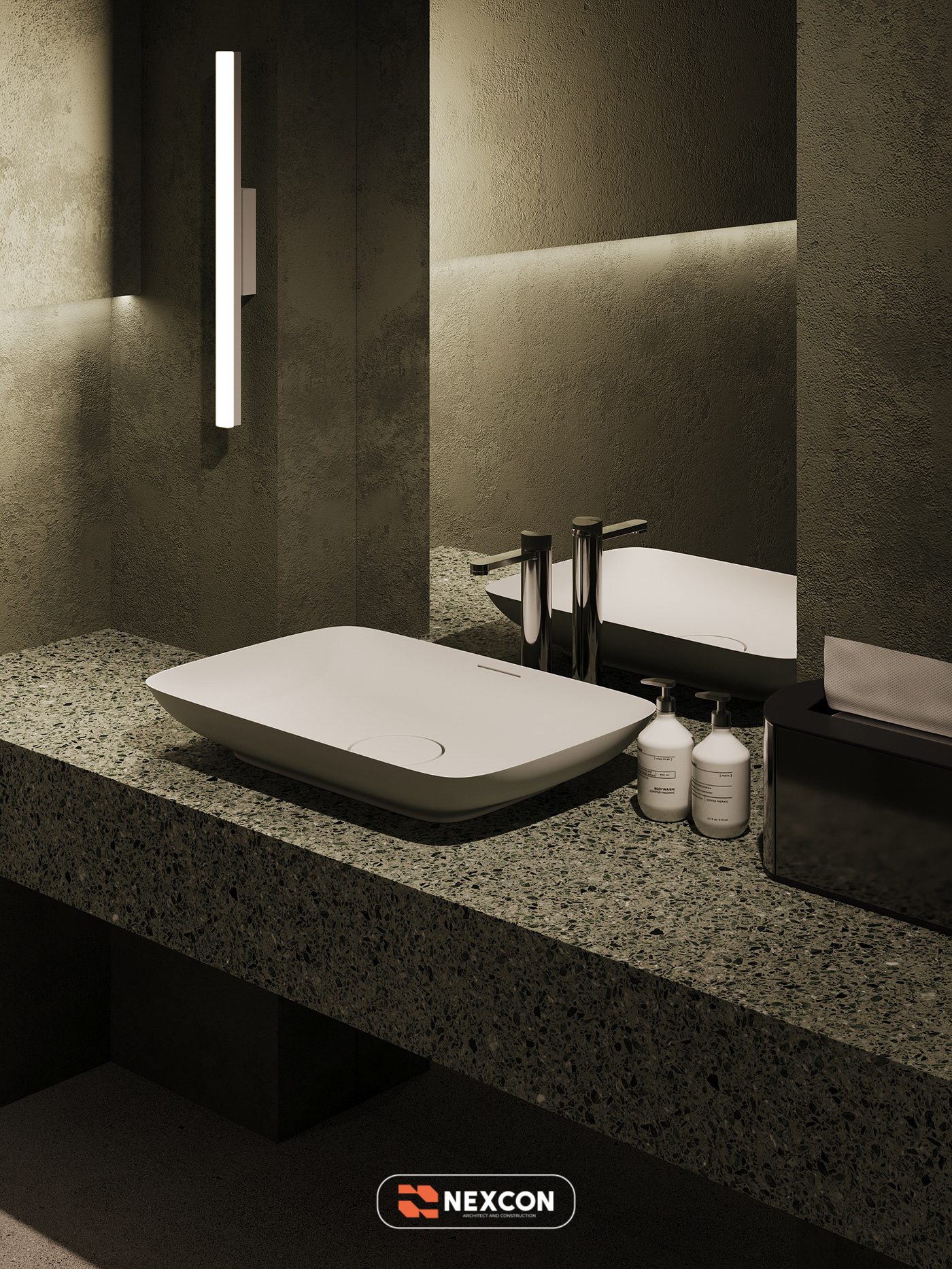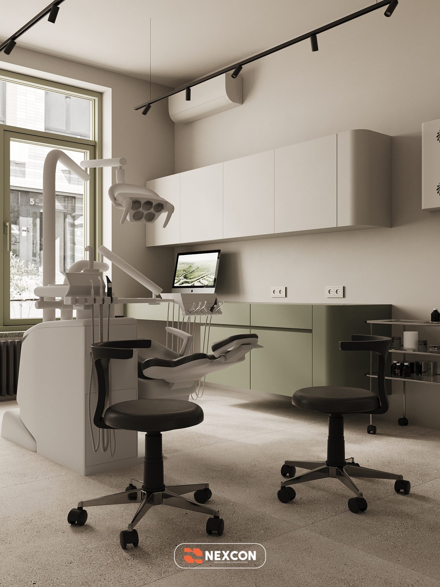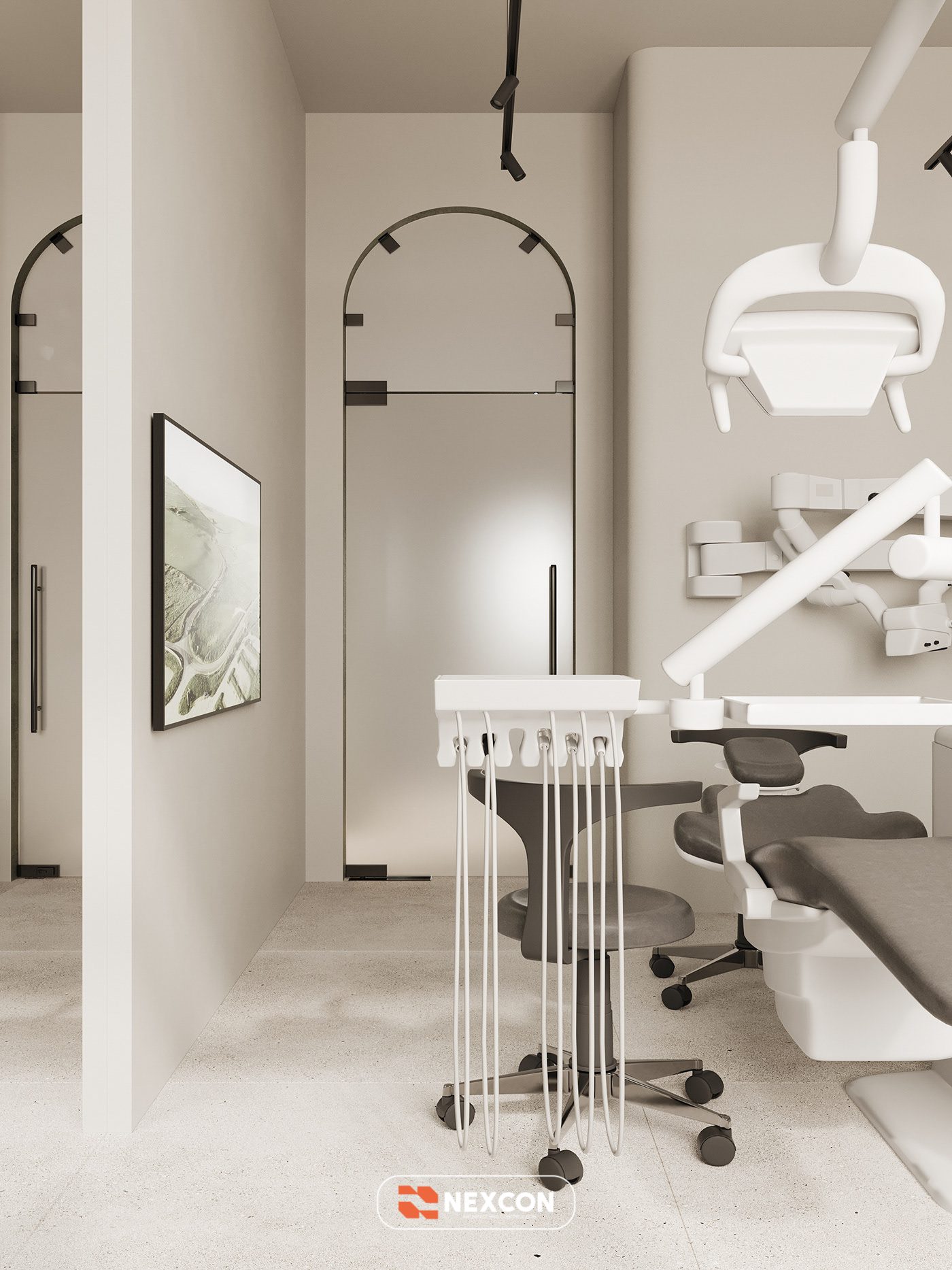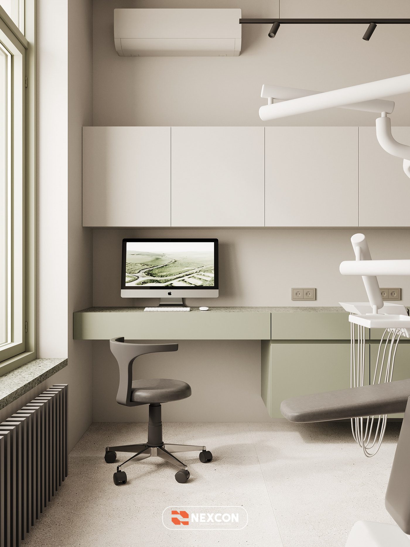 Bảng màu trung tính với các gam olive, be và trắng được sử dụng xuyên suốt dự án, tạo nên cảm giác nhẹ nhàng, thư giãn và giảm áp lực tâm lý cho bệnh nhân khi thăm khám nha khoa. Vật liệu hoàn thiện được lựa chọn kỹ lưỡng, vừa đảm bảo tính thẩm mỹ vừa phù hợp với đặc thù sử dụng của phòng khám.