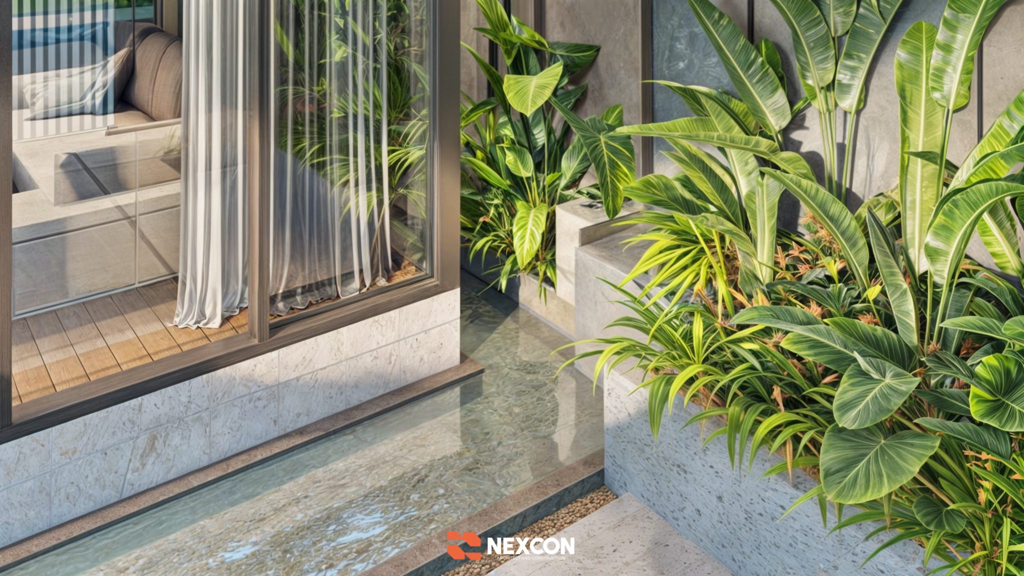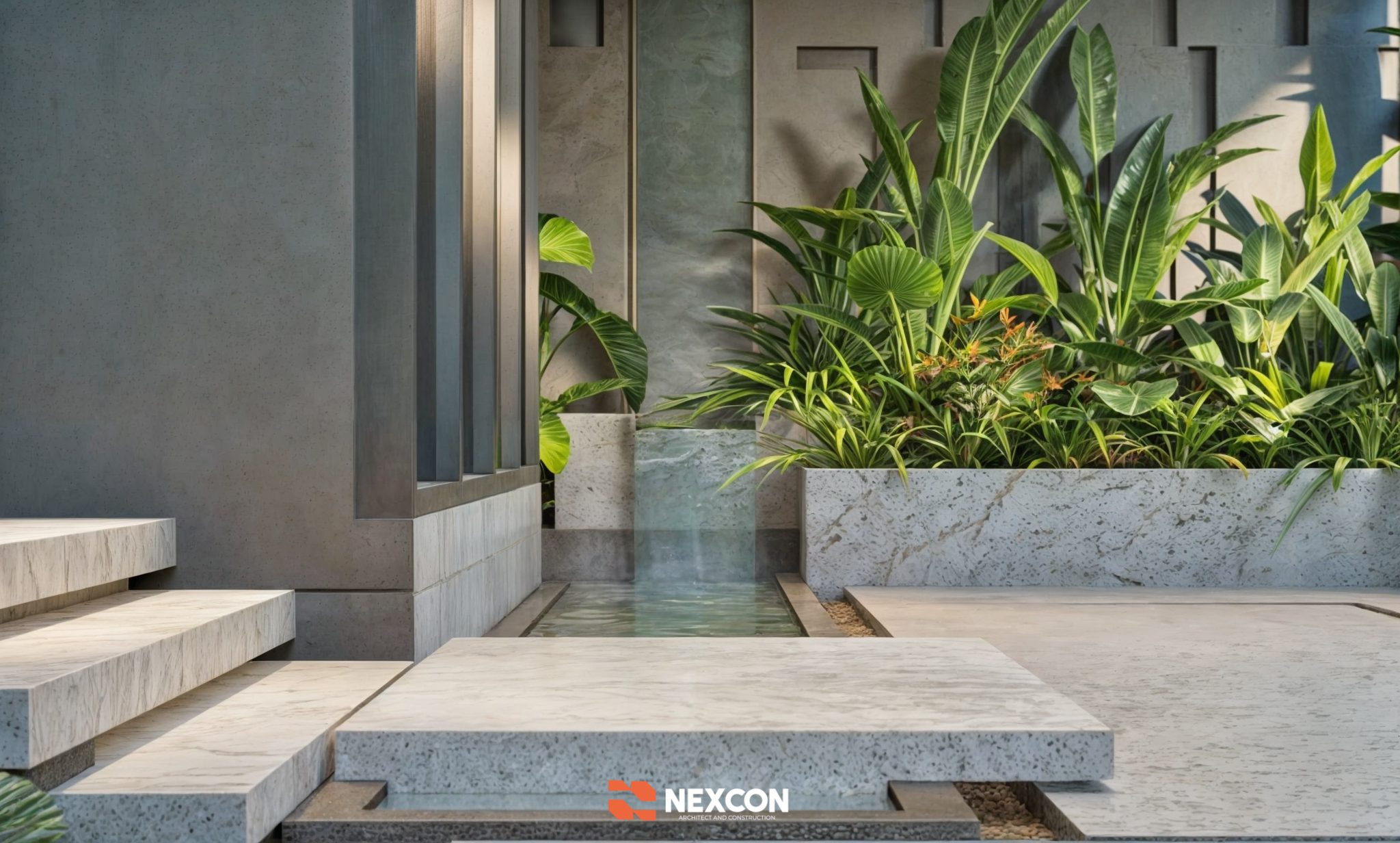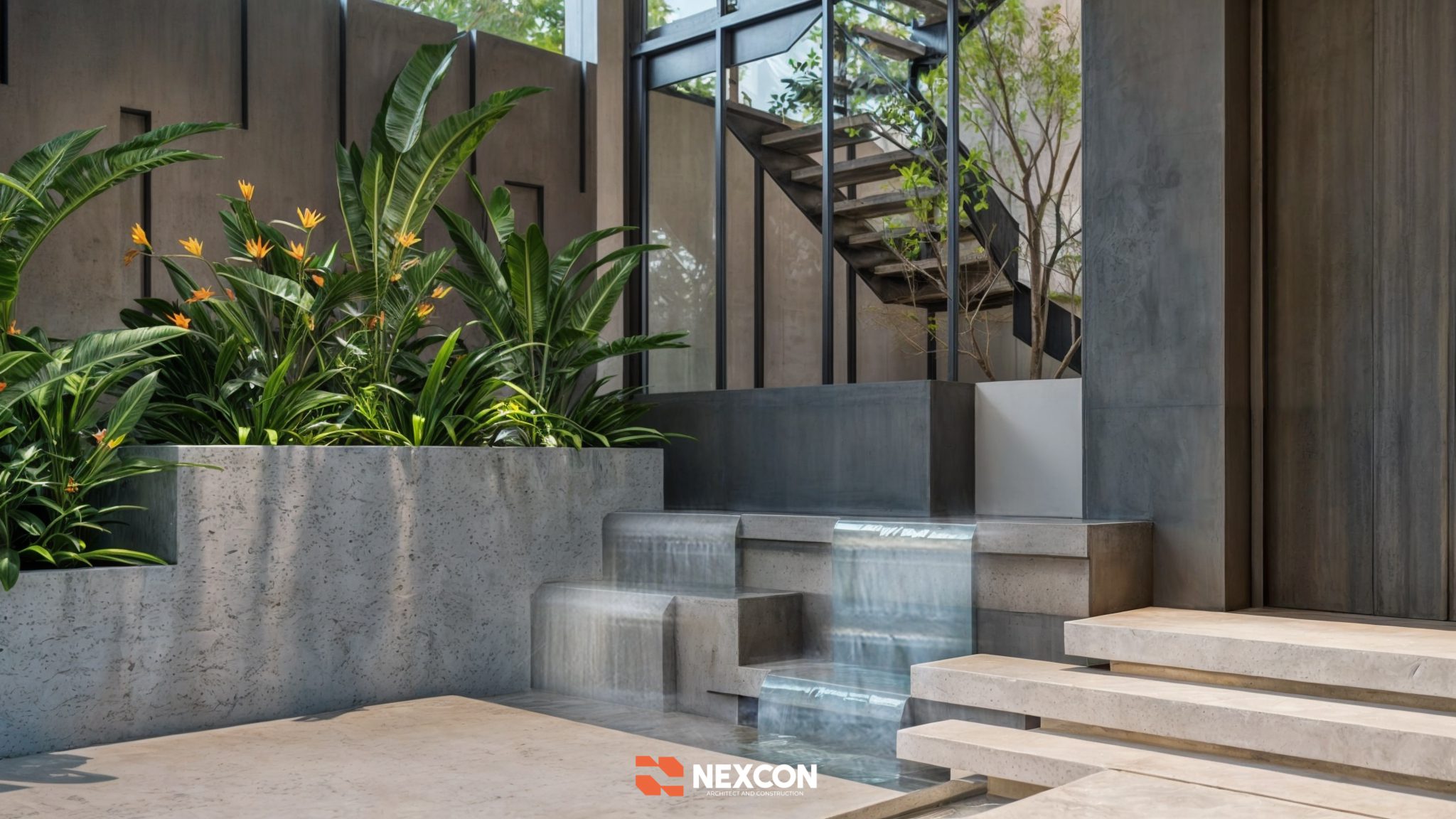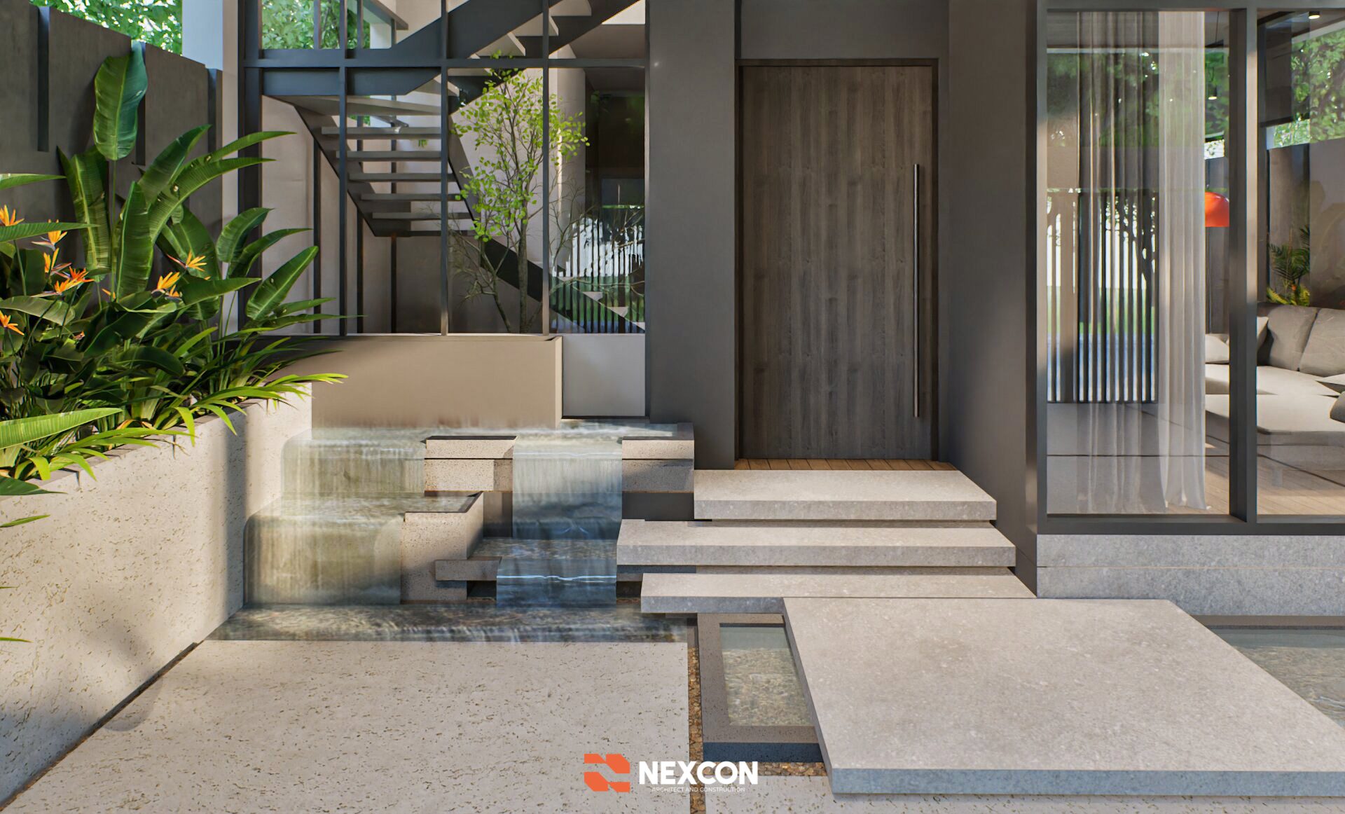 Điểm nhấn lớn của dự án là hệ sân vườn và tiểu cảnh nước chạy xuyên suốt các khu vực. Nước và cây xanh giúp điều hòa nhiệt độ, tạo cảm giác mát mẻ quanh năm.