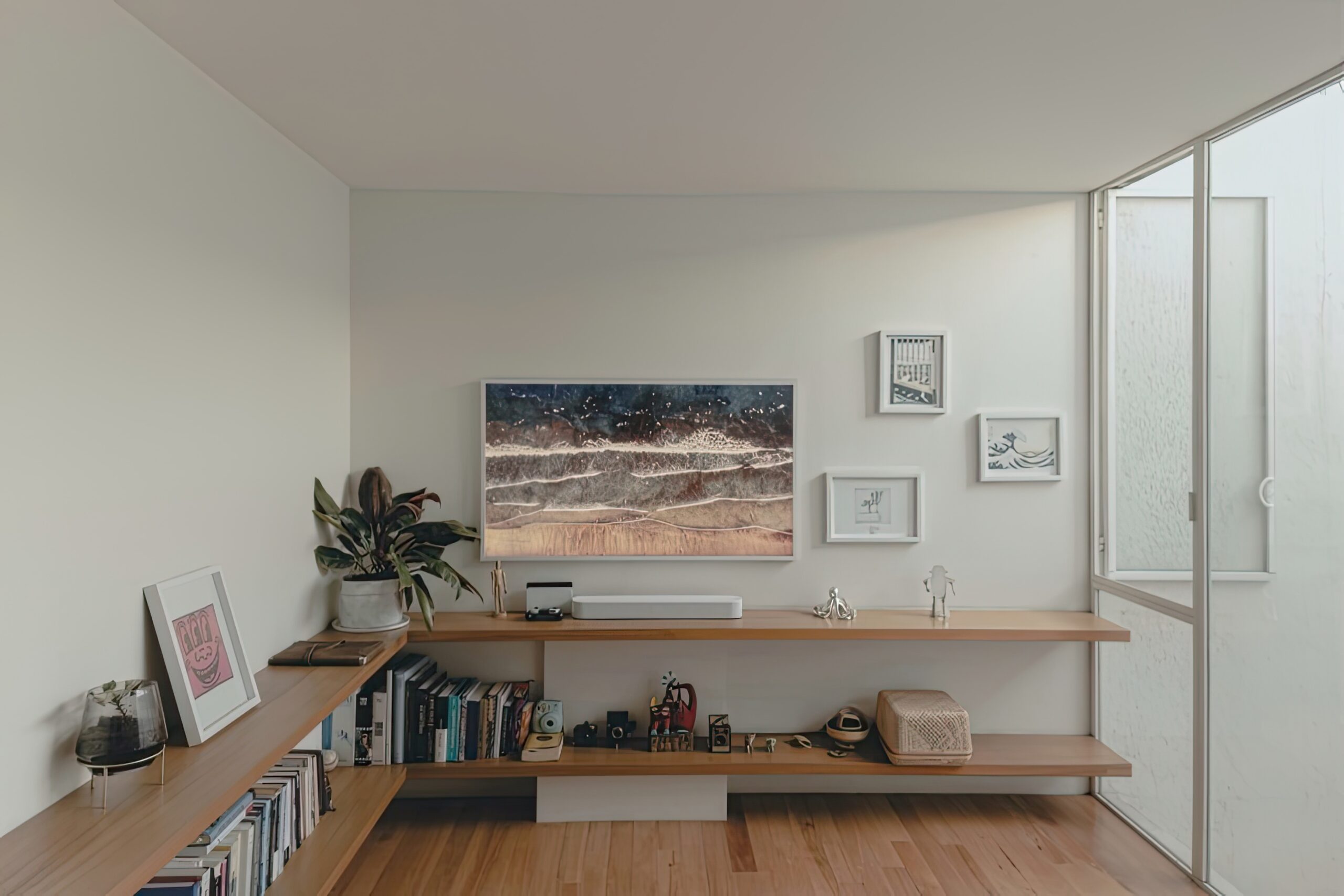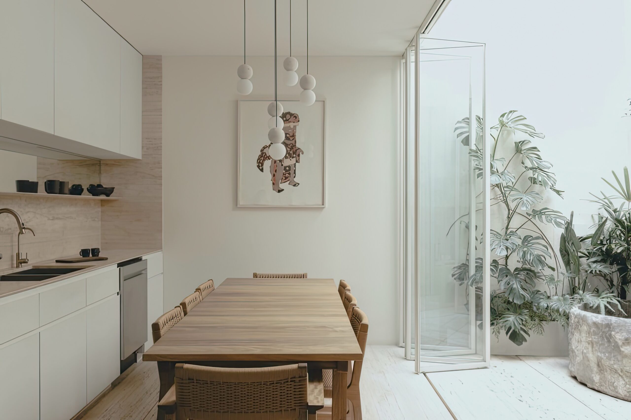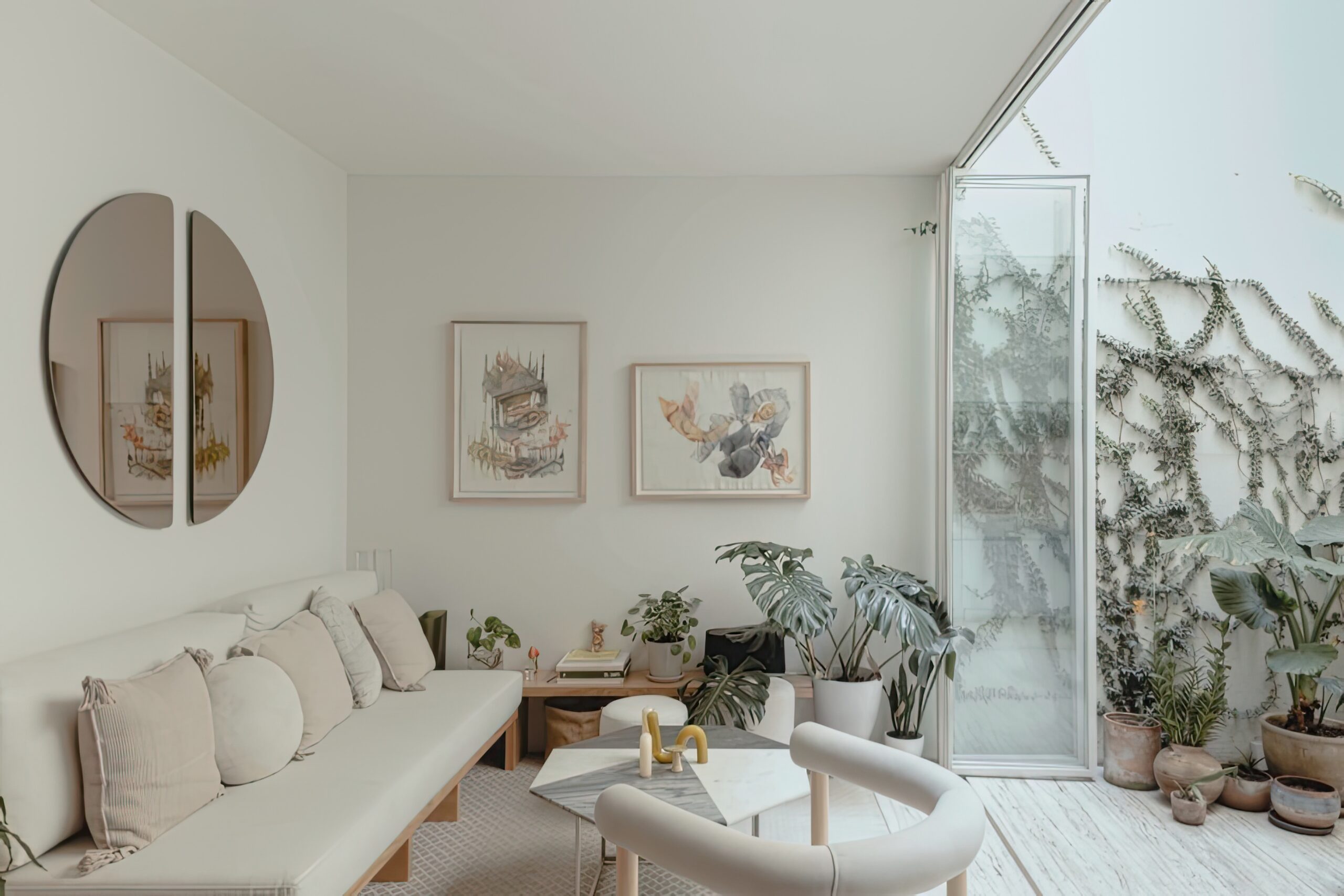Vật liệu chính gồm gỗ tự nhiên, đá sáng và kính lớn. Màu trắng – be – gỗ nhạt tạo nền trung tính.