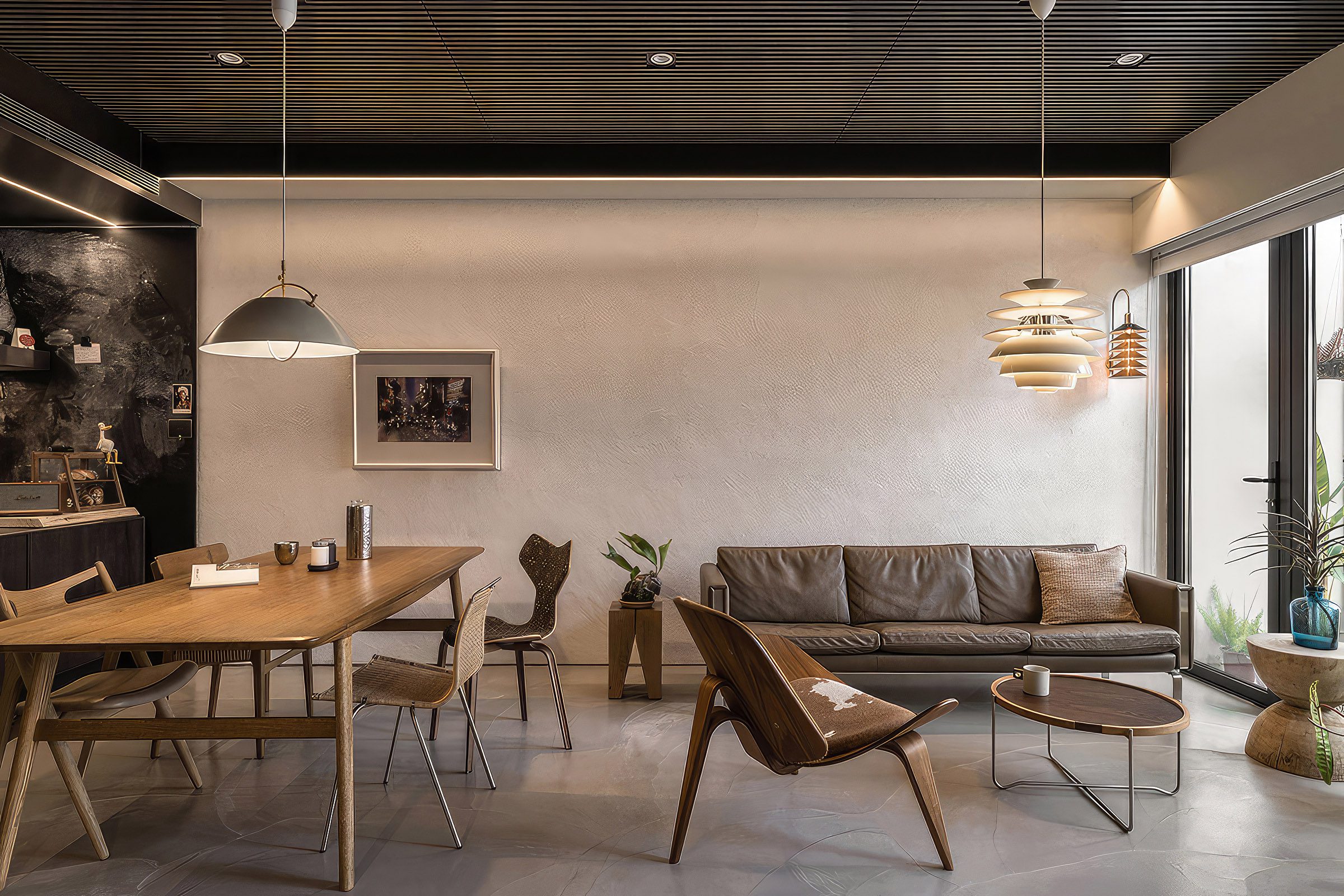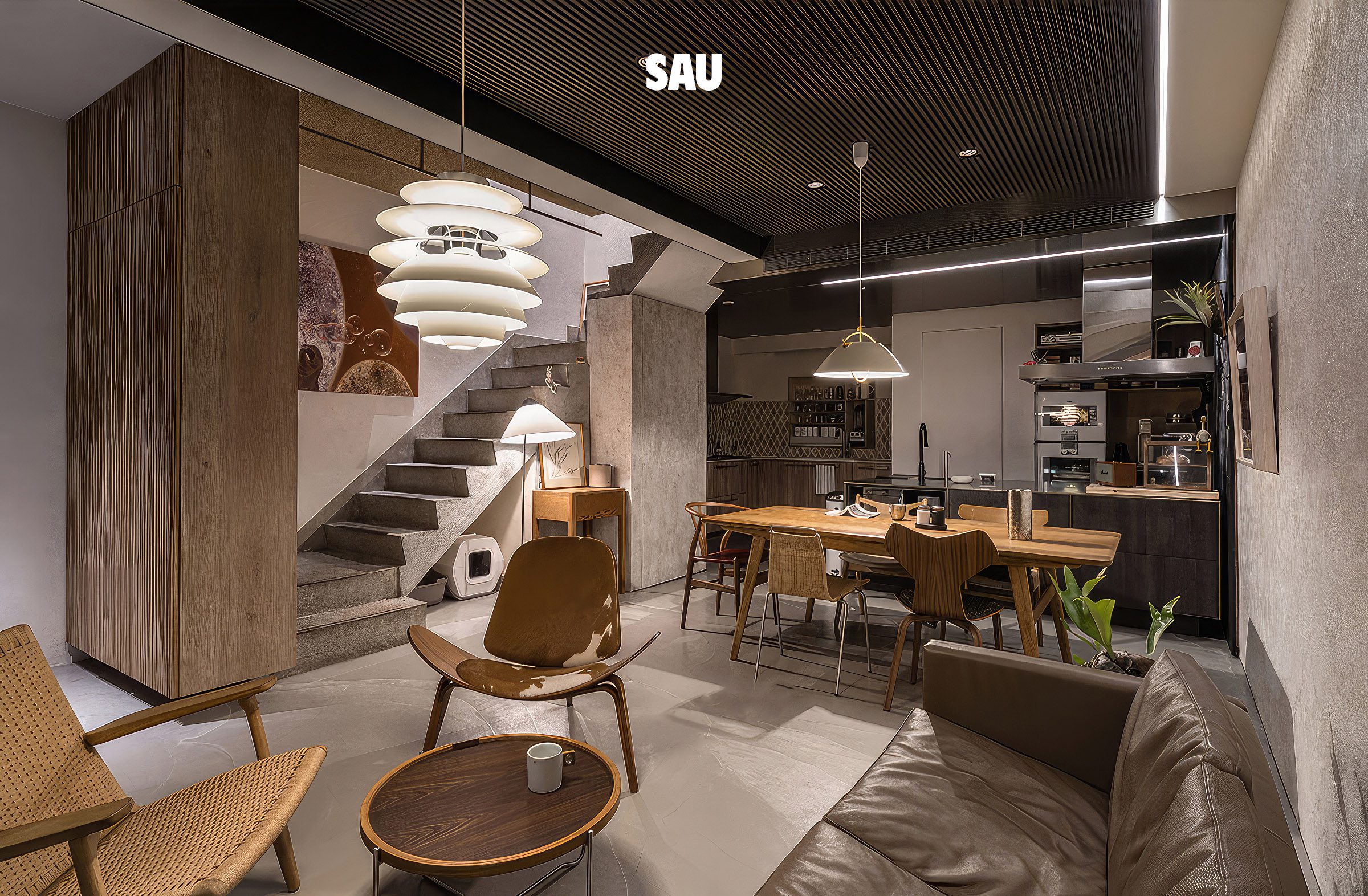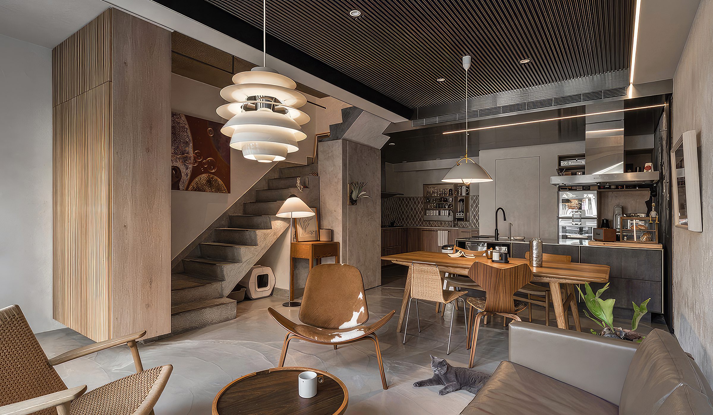 Thiết kế sử dụng bố cục mở và mảng khối rõ ràng. Vật liệu thô được xử lý tinh tế. Ánh sáng đóng vai trò dẫn dắt thị giác. Phong cách loft được tiết chế để phù hợp với sinh hoạt gia đình.