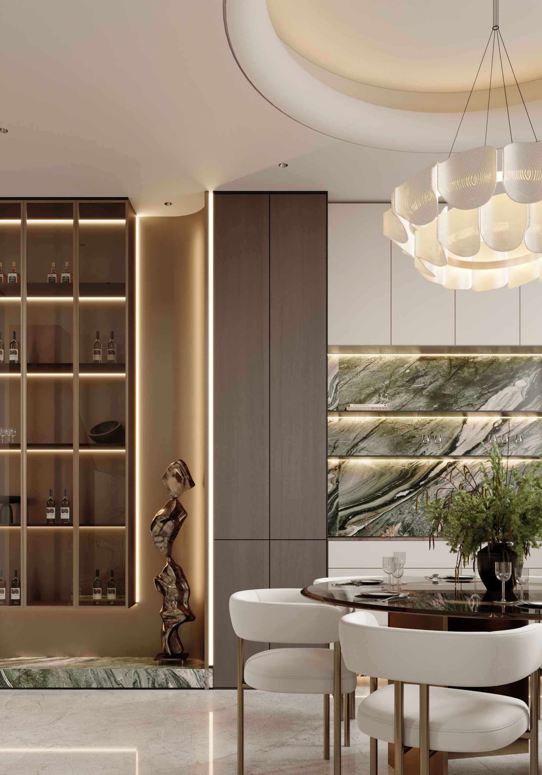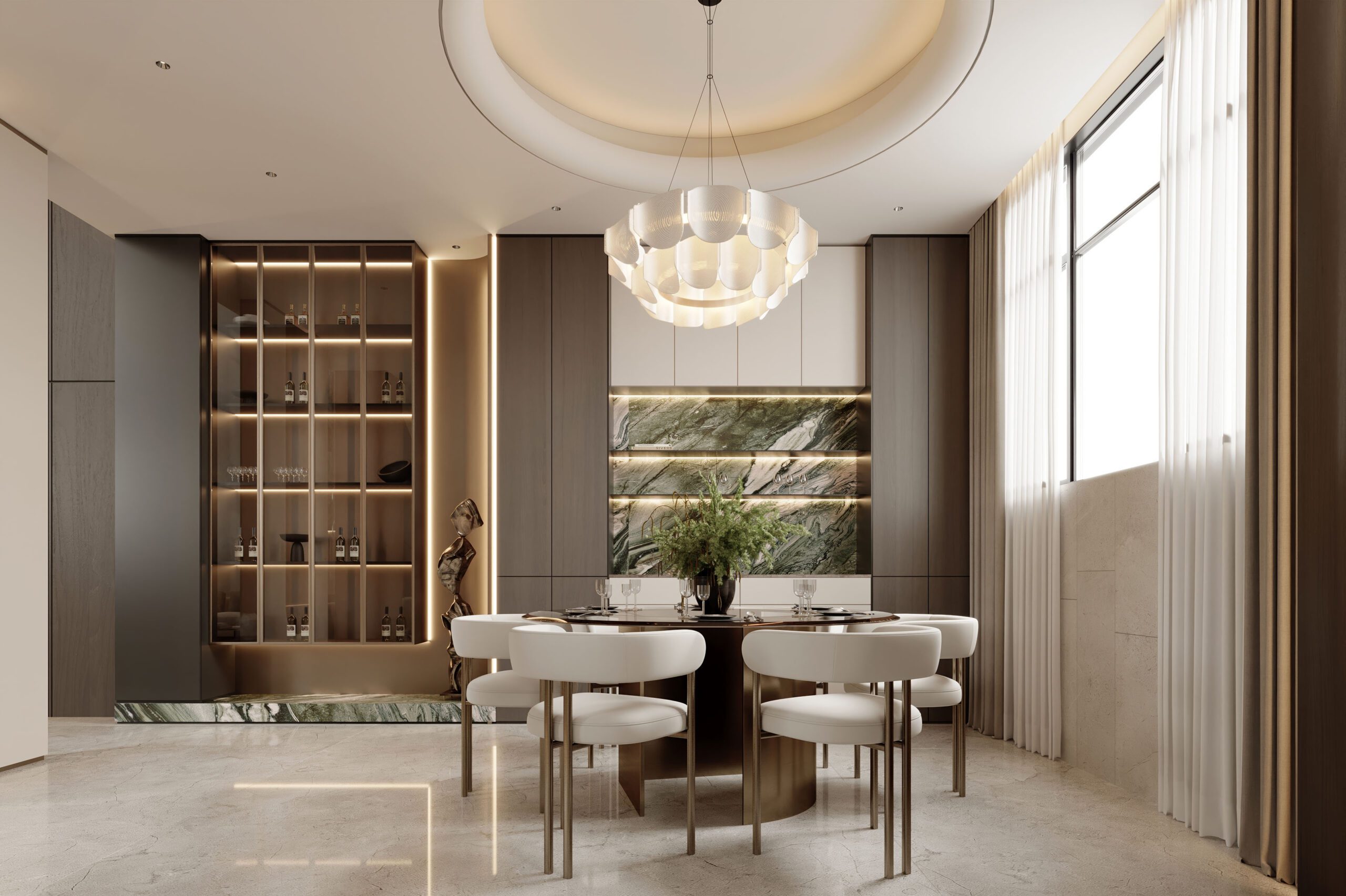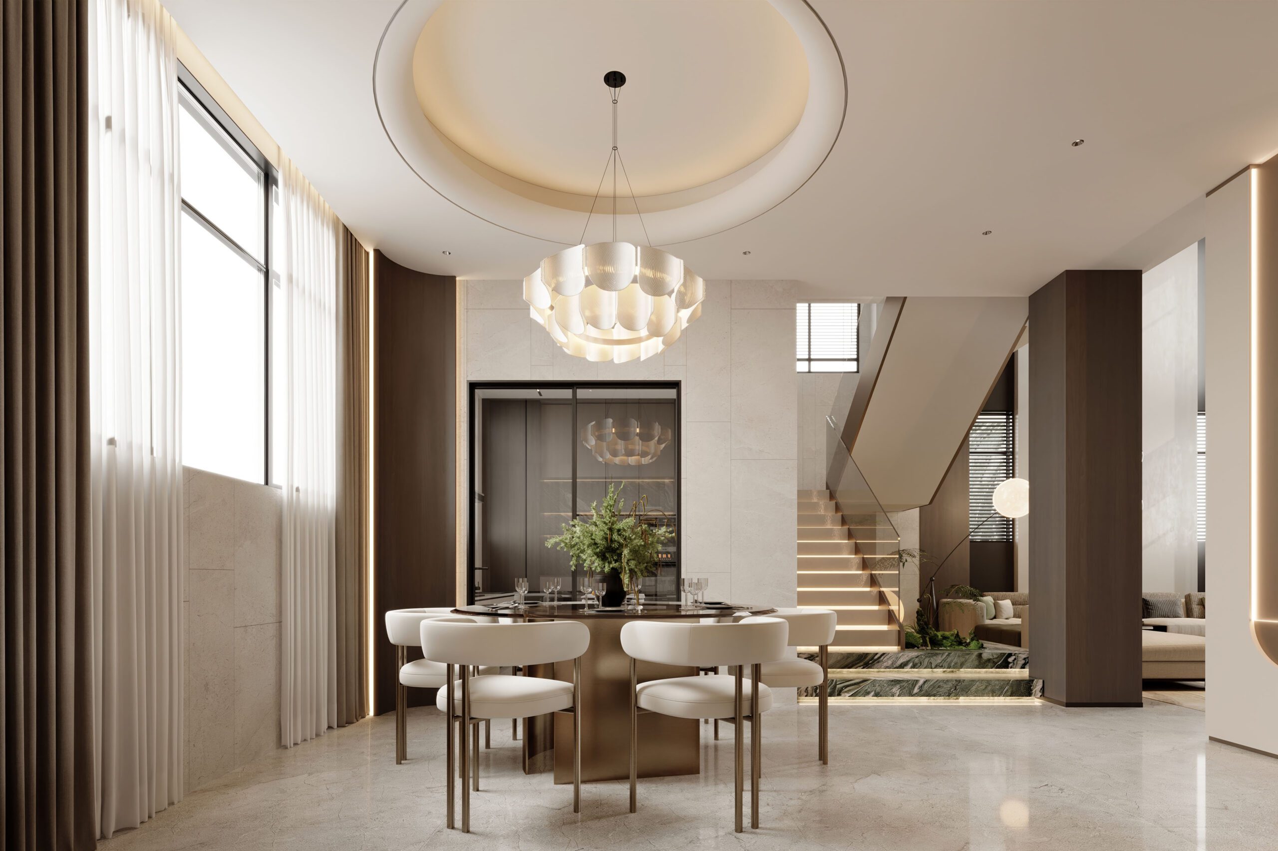 Bàn ăn tròn kết hợp ghế bọc da sáng màu. Các chi tiết kim loại được tiết chế. Tổng thể tạo cảm giác hiện đại và tinh tế.