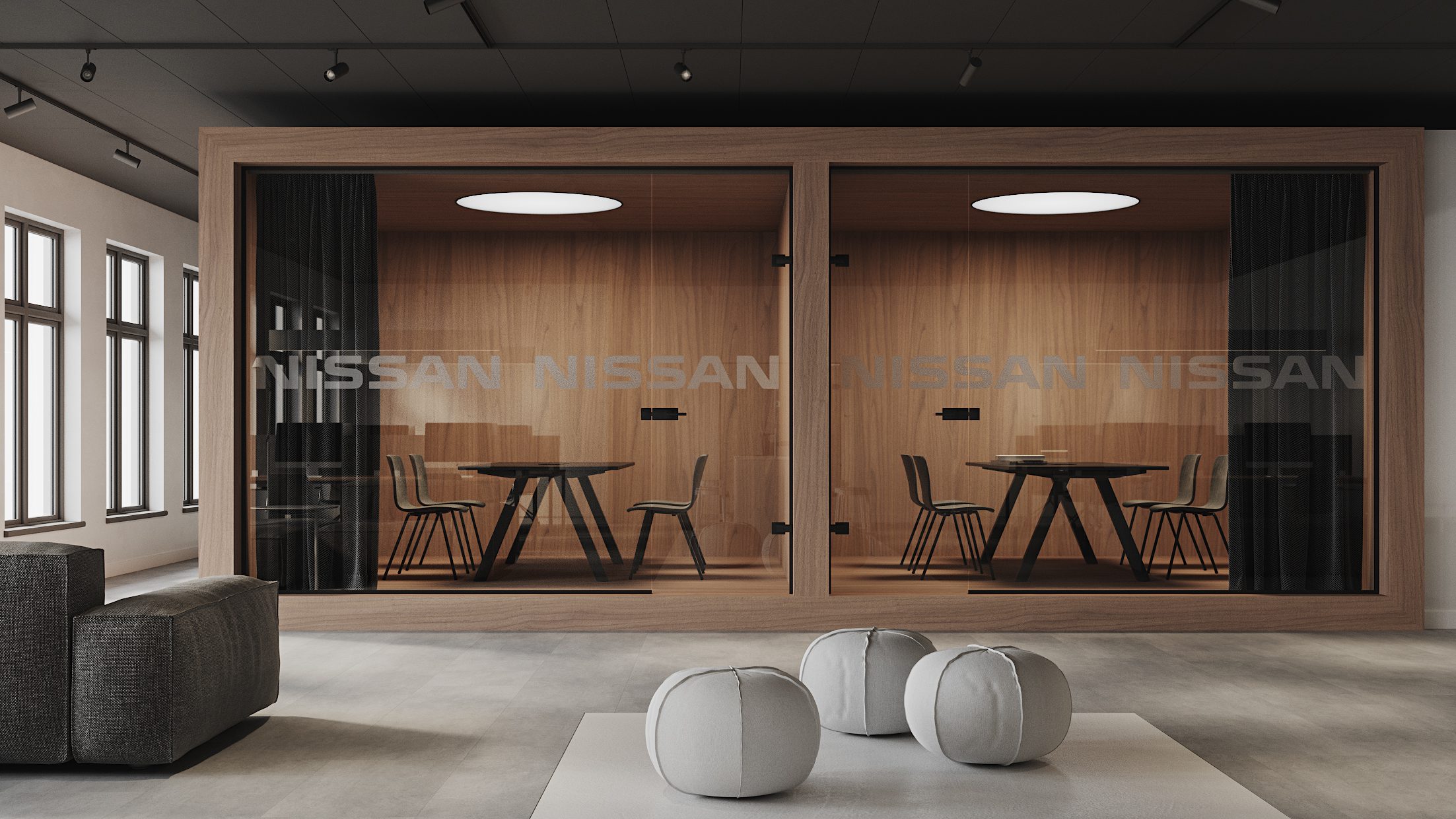 Logo Nissan được xử lý mờ trên bề mặt kính. Chi tiết này giúp tăng nhận diện thương hiệu một cách tinh tế. Không gian phòng họp vừa riêng tư vừa kết nối với tổng thể văn phòng.