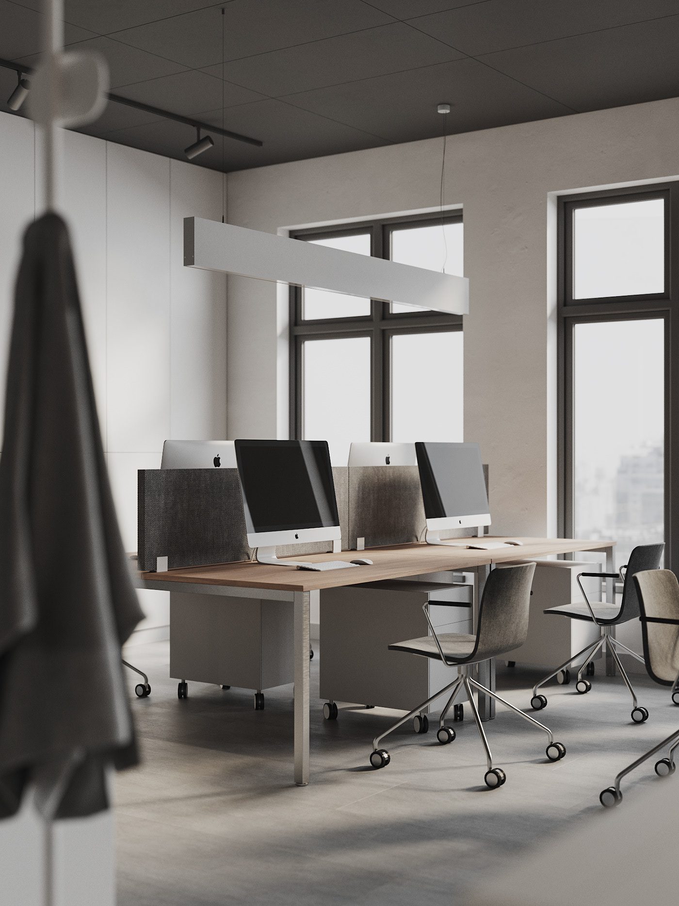 Khu vực làm việc chung được bố trí theo dạng bàn dài song song. Cách sắp xếp này giúp tối ưu diện tích và tăng khả năng tương tác nhóm. Vách nỉ tiêu âm màu trung tính được tích hợp nhằm giảm tiếng ồn và tạo sự tập trung.