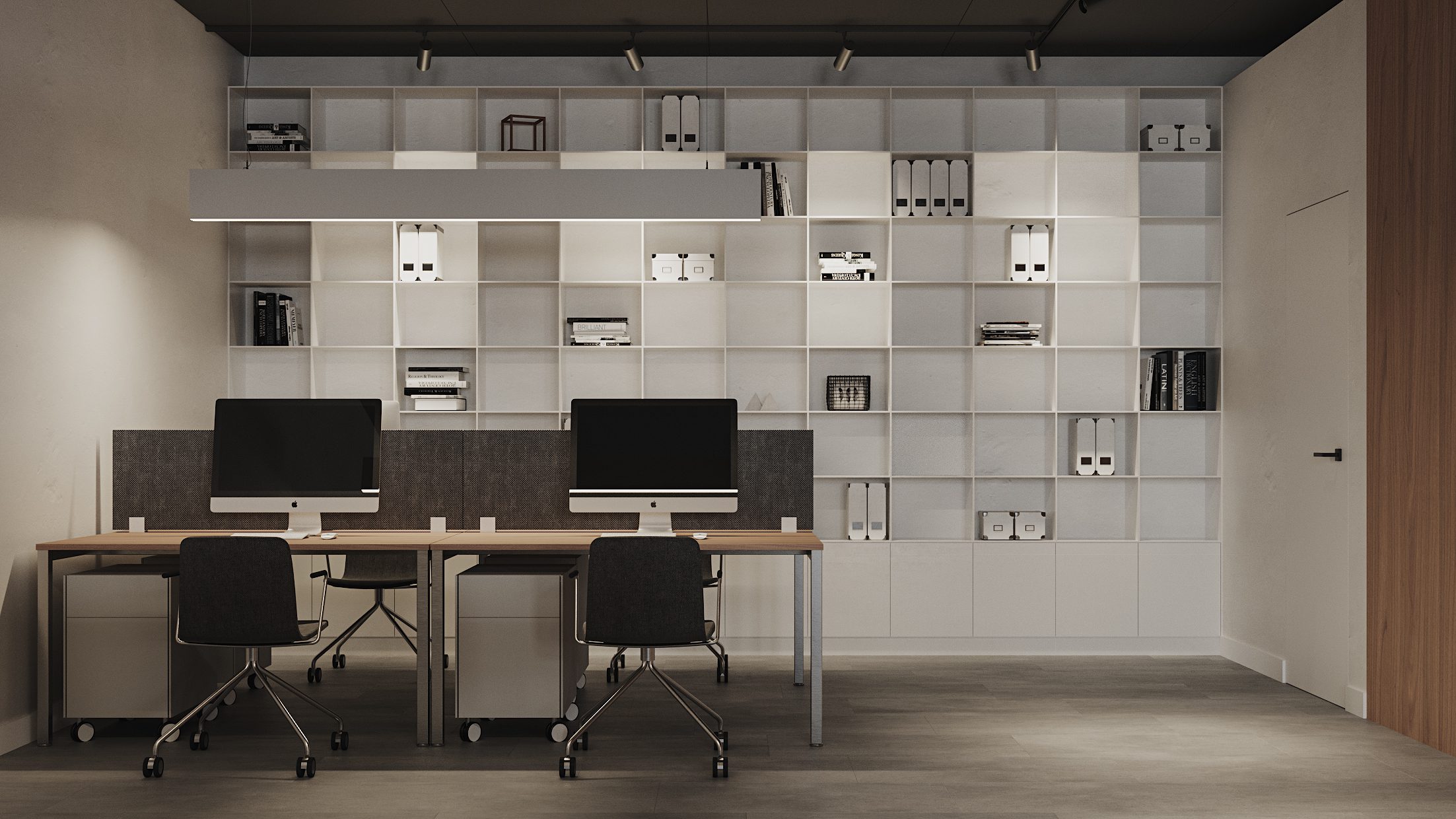 Hệ chiếu sáng nhân tạo được kiểm soát chặt chẽ. Ánh sáng đảm bảo tiêu chuẩn làm việc và tạo chiều sâu không gian. Tổng thể mang lại cảm giác chuyên nghiệp và đồng bộ thương hiệu.
