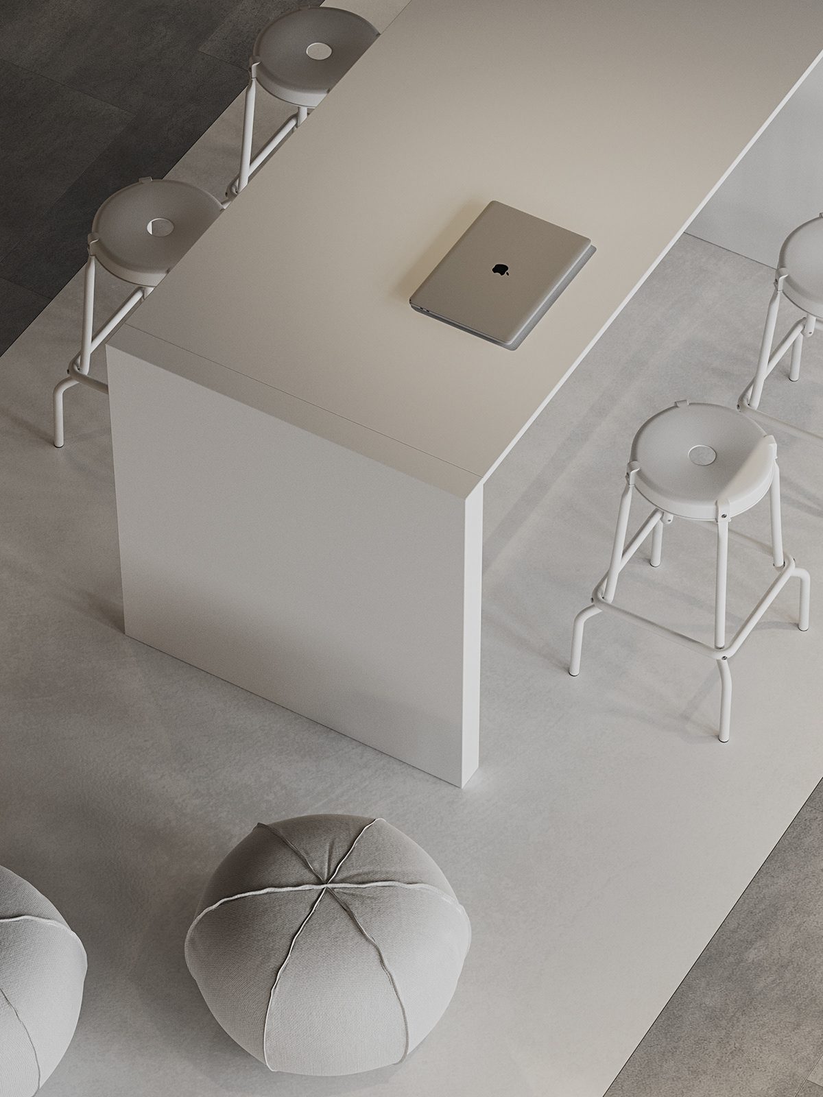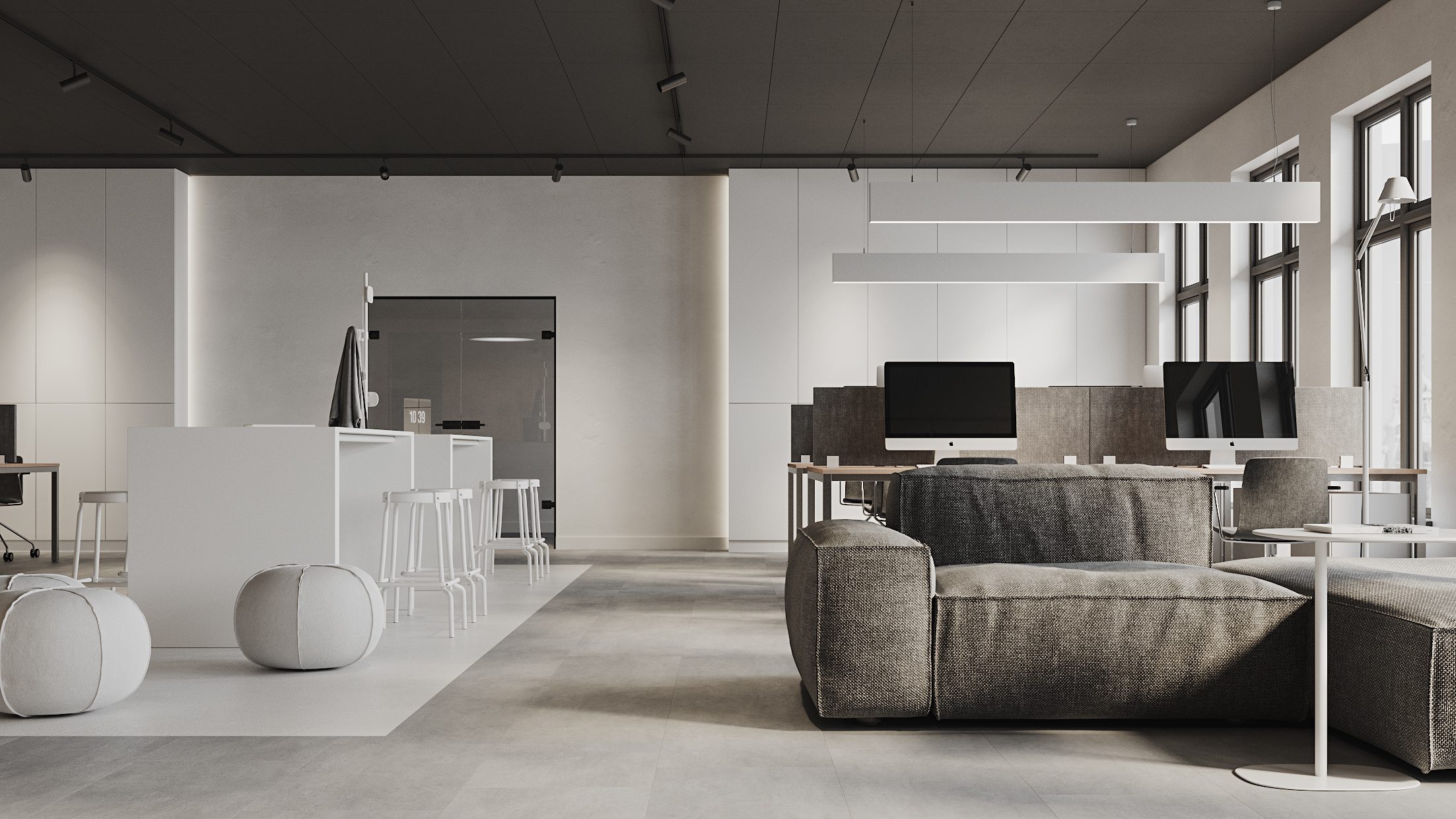 Khu pantry được bố trí với bàn đảo trung tâm và ghế bar tối giản. Đây là nơi nhân sự nghỉ ngơi ngắn và trao đổi không chính thức. Không gian lounge liền kề được thiết kế với sofa mềm và bàn thấp.