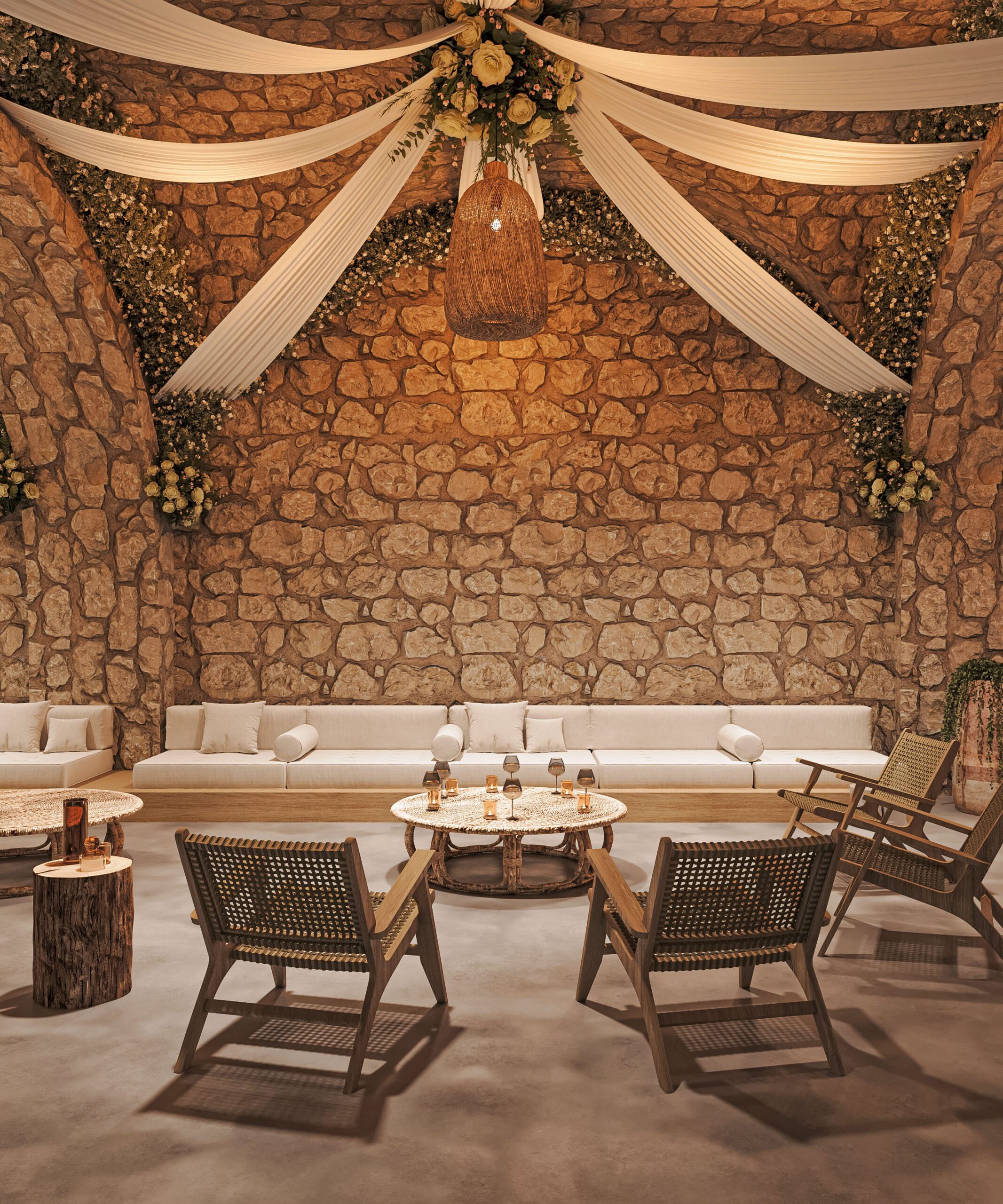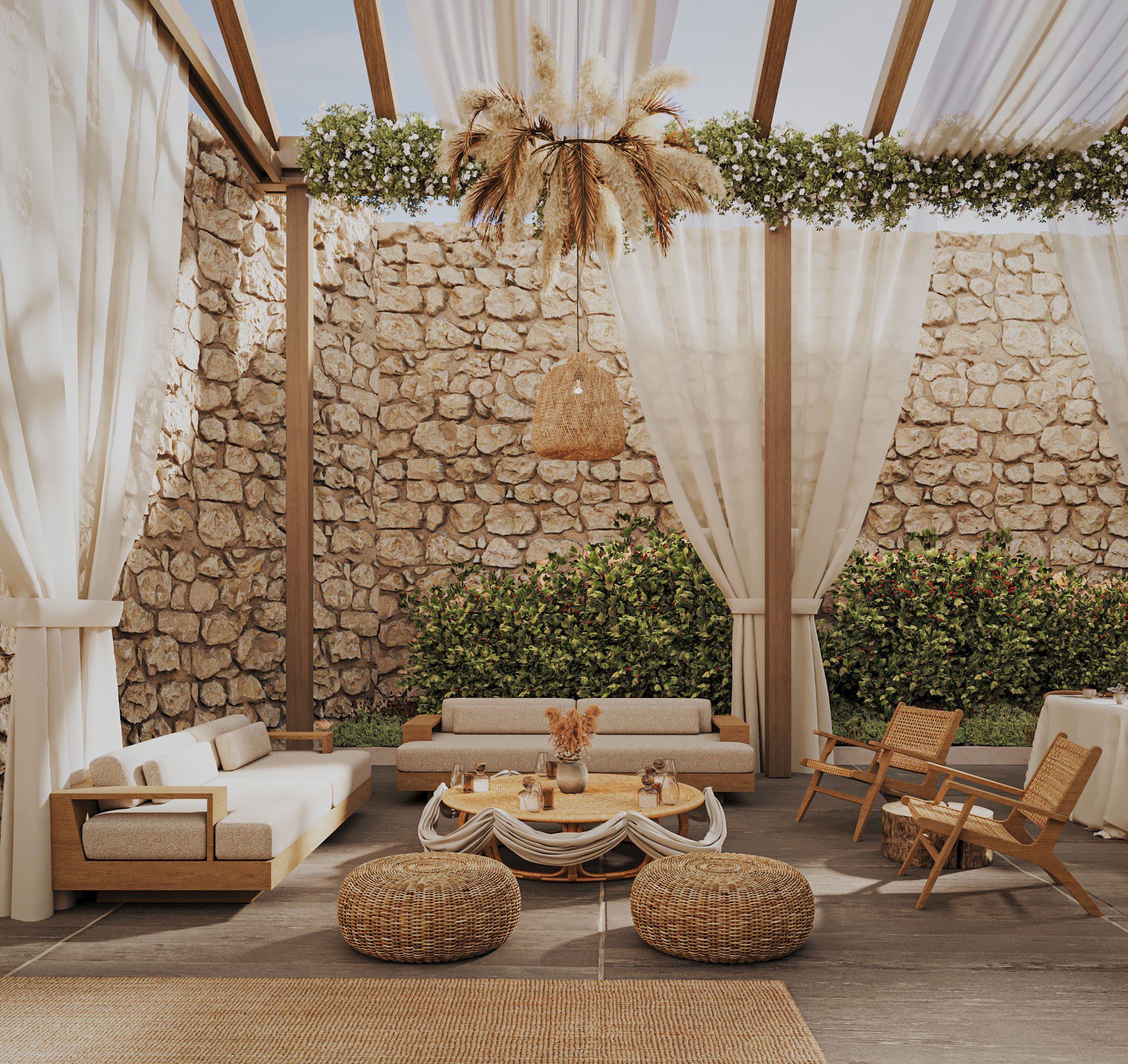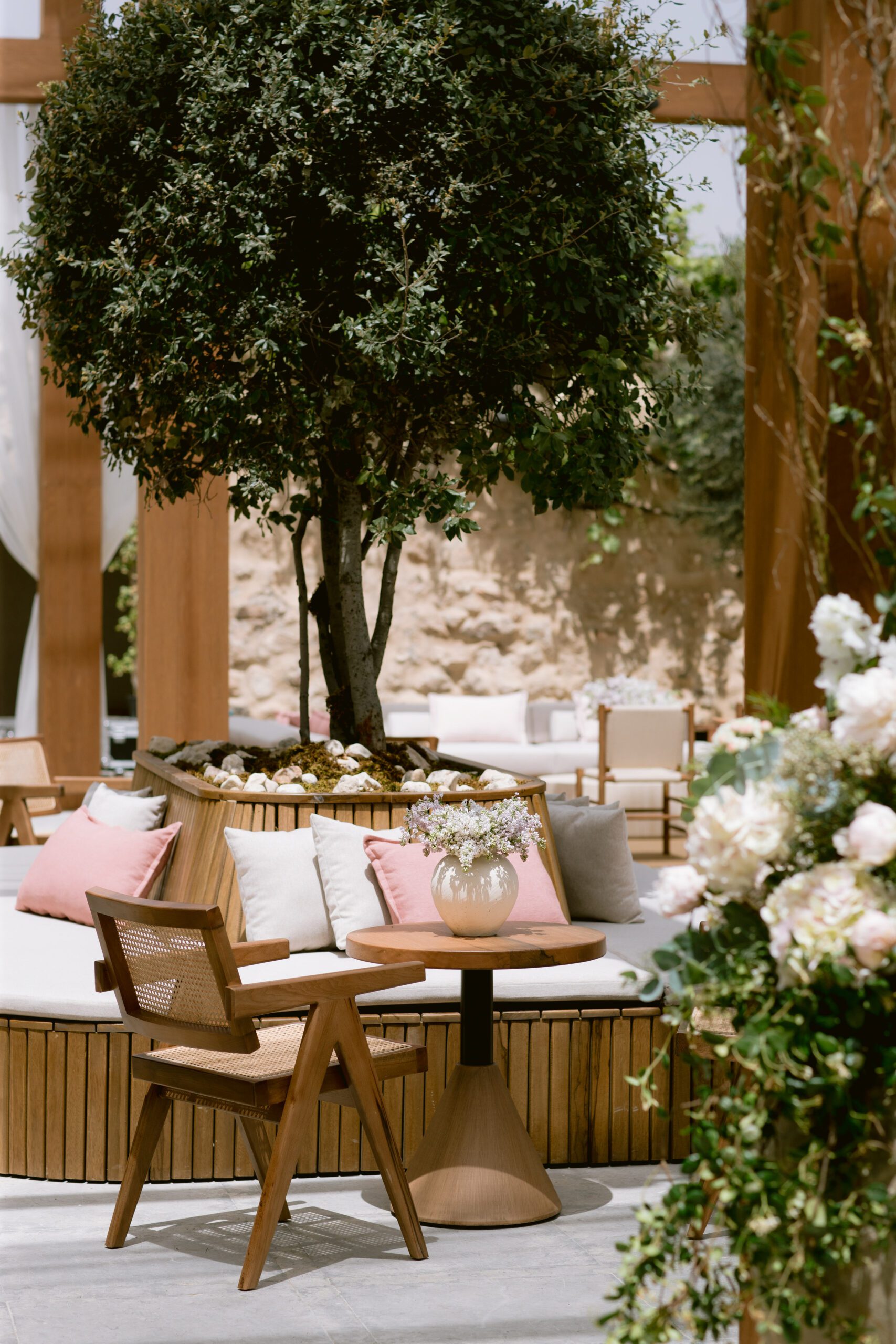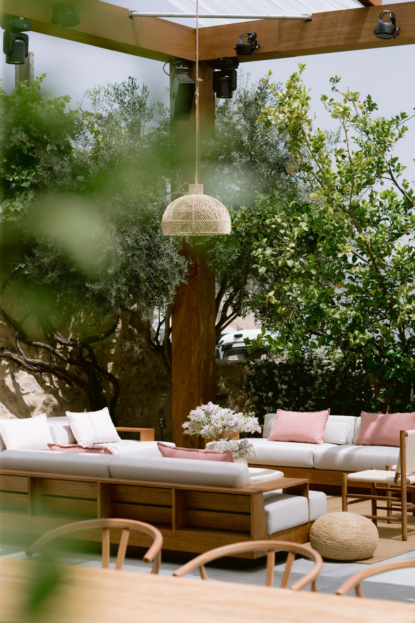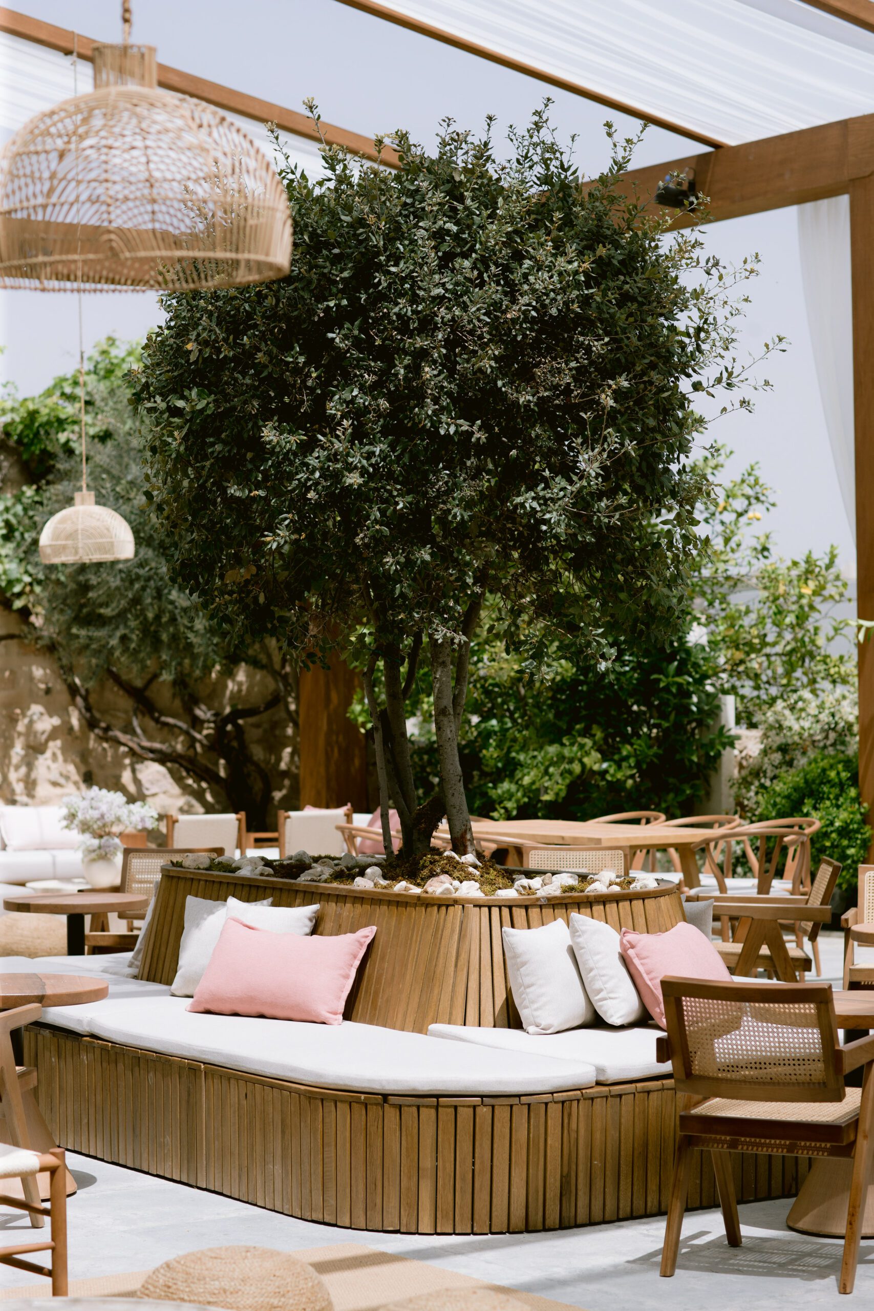 Gỗ tự nhiên, mây tre và đá thô là vật liệu chủ đạo. Ánh sáng vàng ấm giúp không gian luôn dễ chịu vào buổi tối. Cây xanh được bố trí thành từng lớp, tạo chiều sâu thị giác rõ rệt.