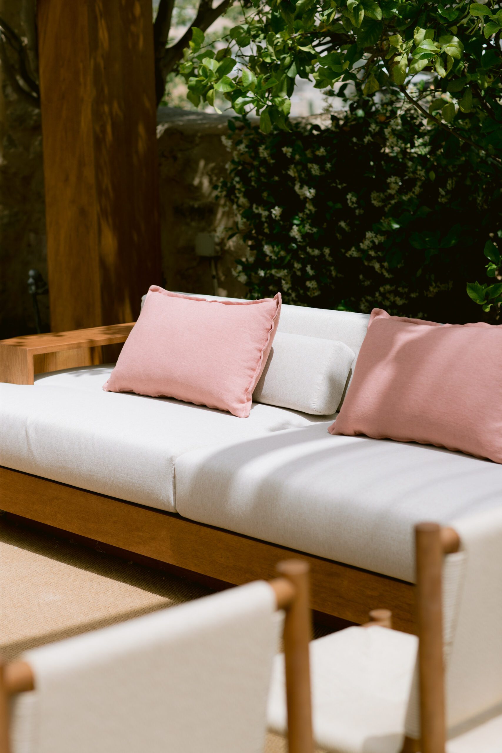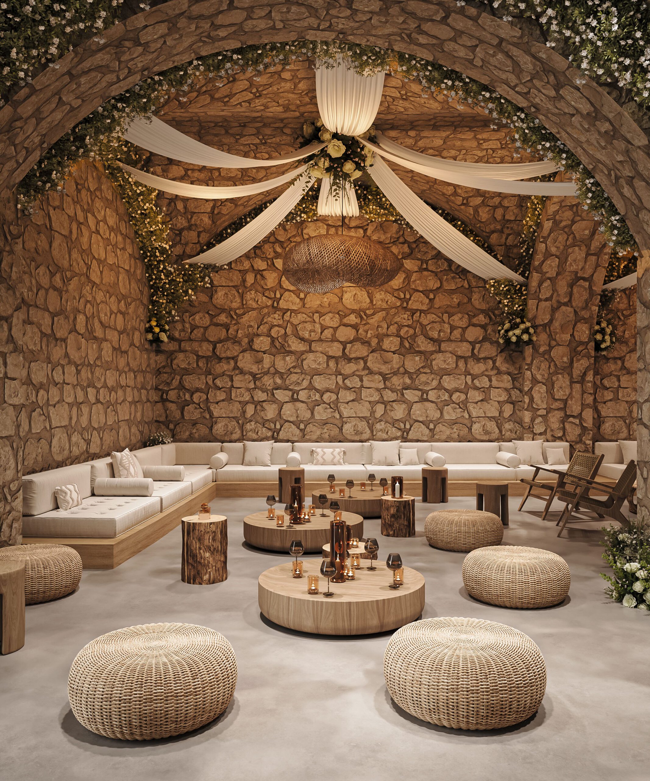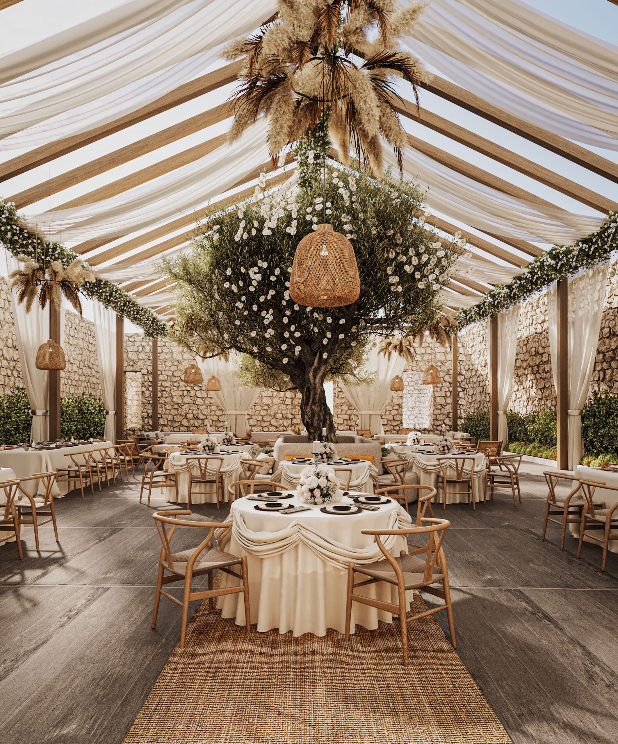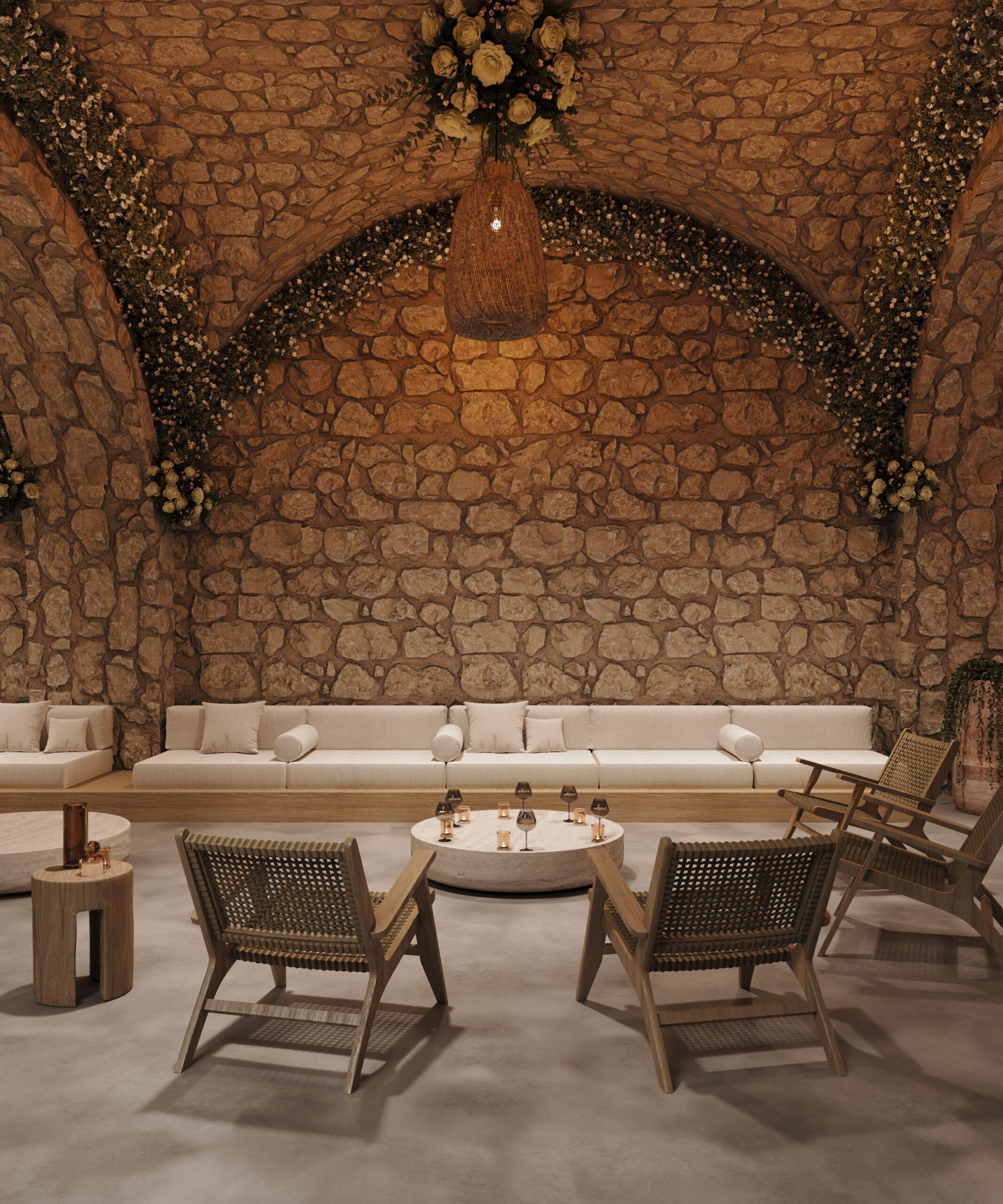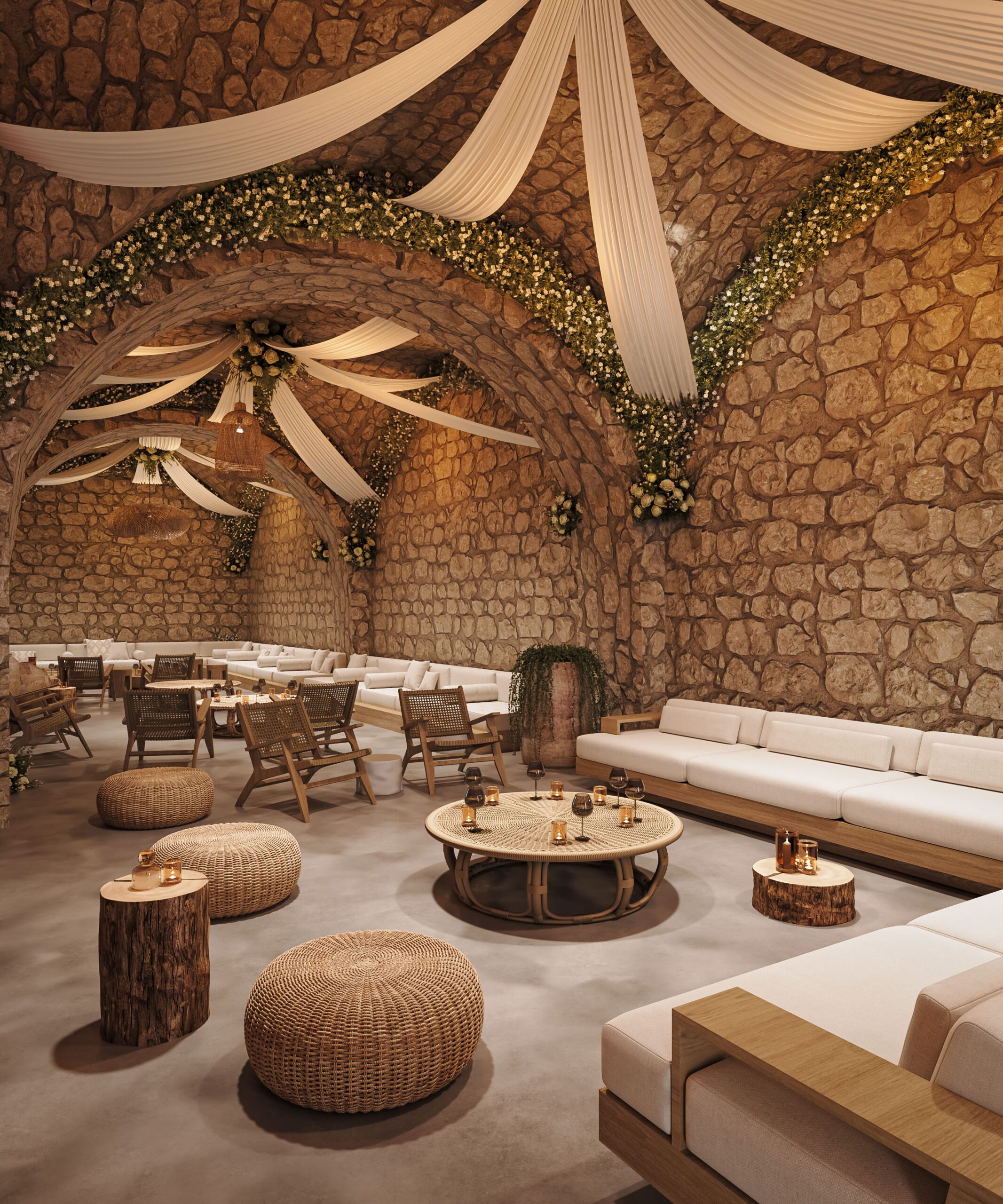 Gỗ tự nhiên, mây tre và đá thô là vật liệu chủ đạo. Ánh sáng vàng ấm giúp không gian luôn dễ chịu vào buổi tối. Cây xanh được bố trí thành từng lớp, tạo chiều sâu thị giác rõ rệt.
