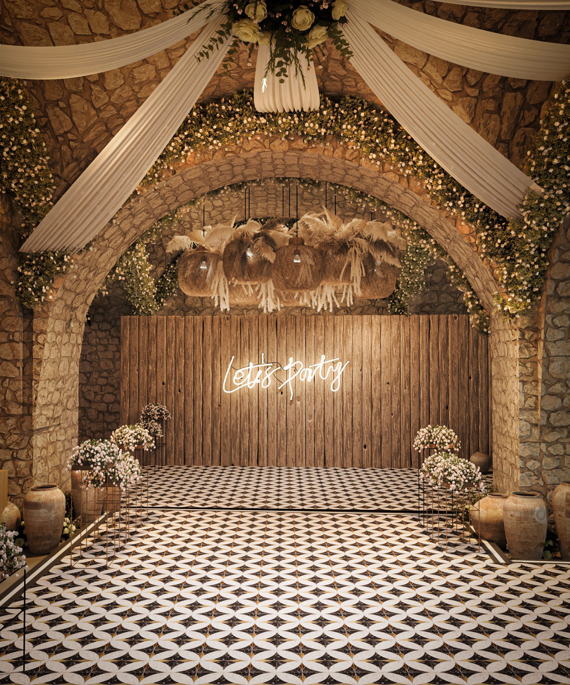 Thiết kế cafe sân vườn được chia thành ba khu chính: khu sân trung tâm, khu lounge vòm đá và khu bàn tiệc dưới mái che. Mỗi khu vực có phong cách bố trí riêng nhưng vẫn liên kết hài hòa.