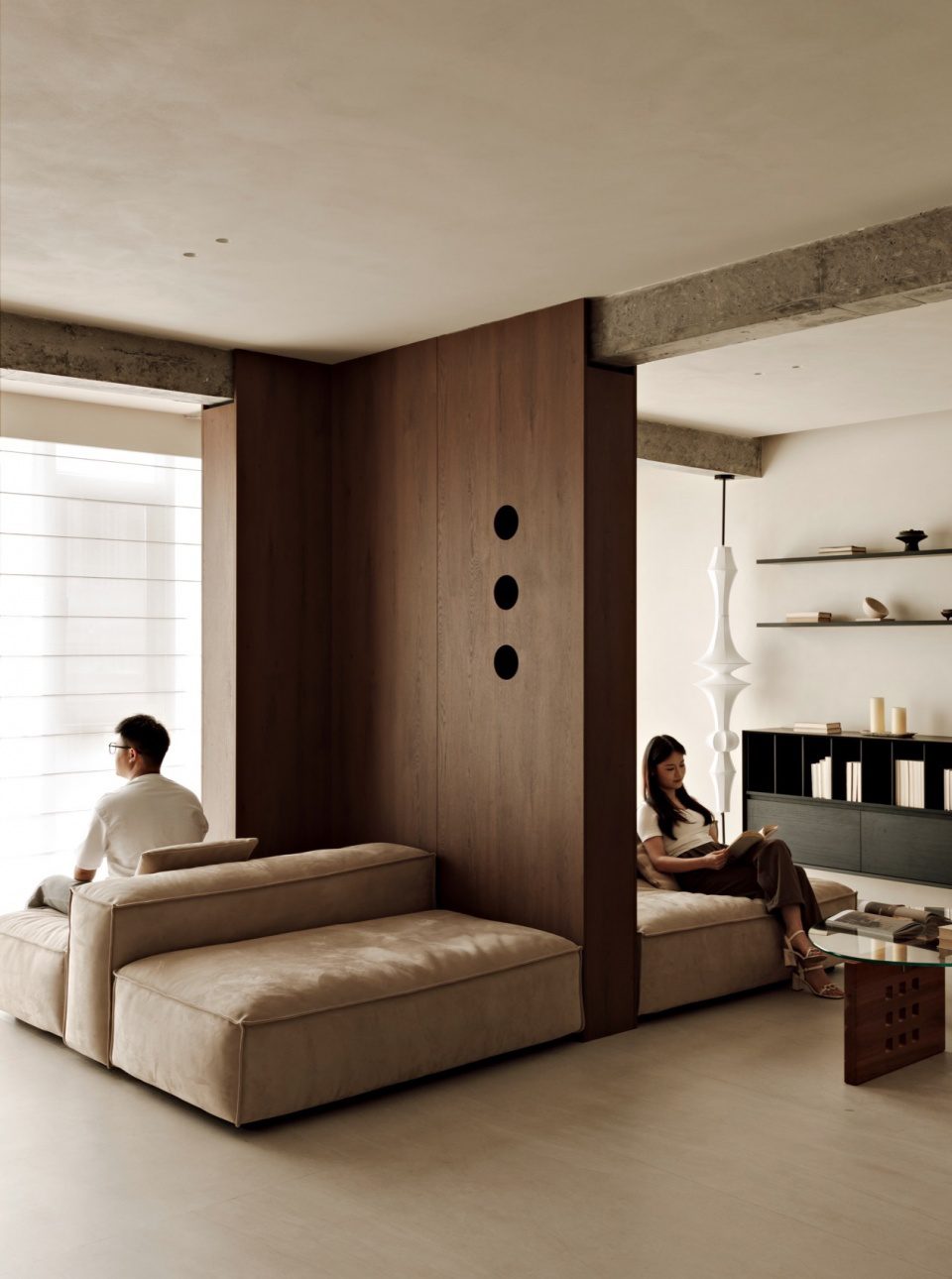 Khu vực phòng khách được tổ chức mở. Vách gỗ cong đóng vai trò phân tách nhẹ nhàng giữa các không gian sinh hoạt. Ánh sáng khuếch tán qua lớp rèm mỏng, mang lại bầu không khí dịu nhẹ và thư thái.