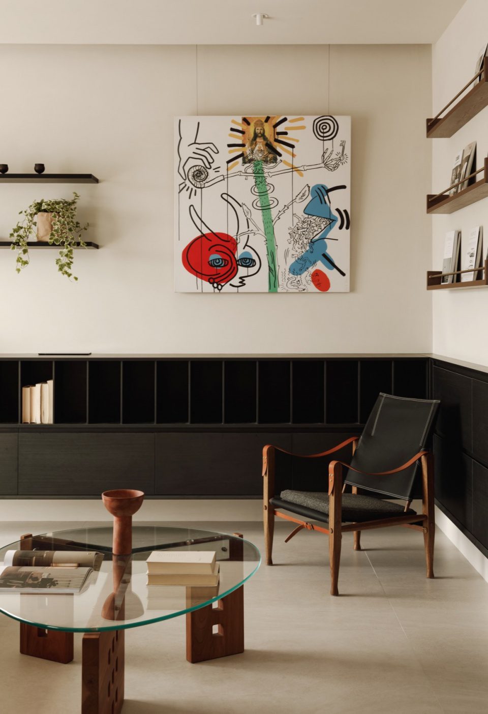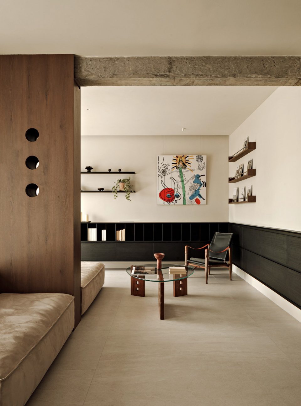 Hệ kệ âm tường và tủ lưu trữ được thiết kế liền mạch. Tỷ lệ vừa đủ giúp không gian gọn gàng nhưng không khô cứng. Nội thất rời được chọn lọc kỹ, ưu tiên hình khối đơn giản và chất liệu tự nhiên.