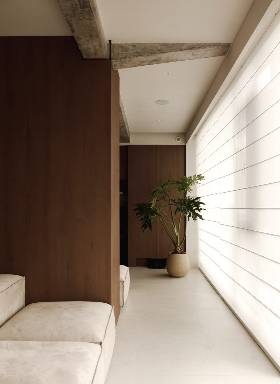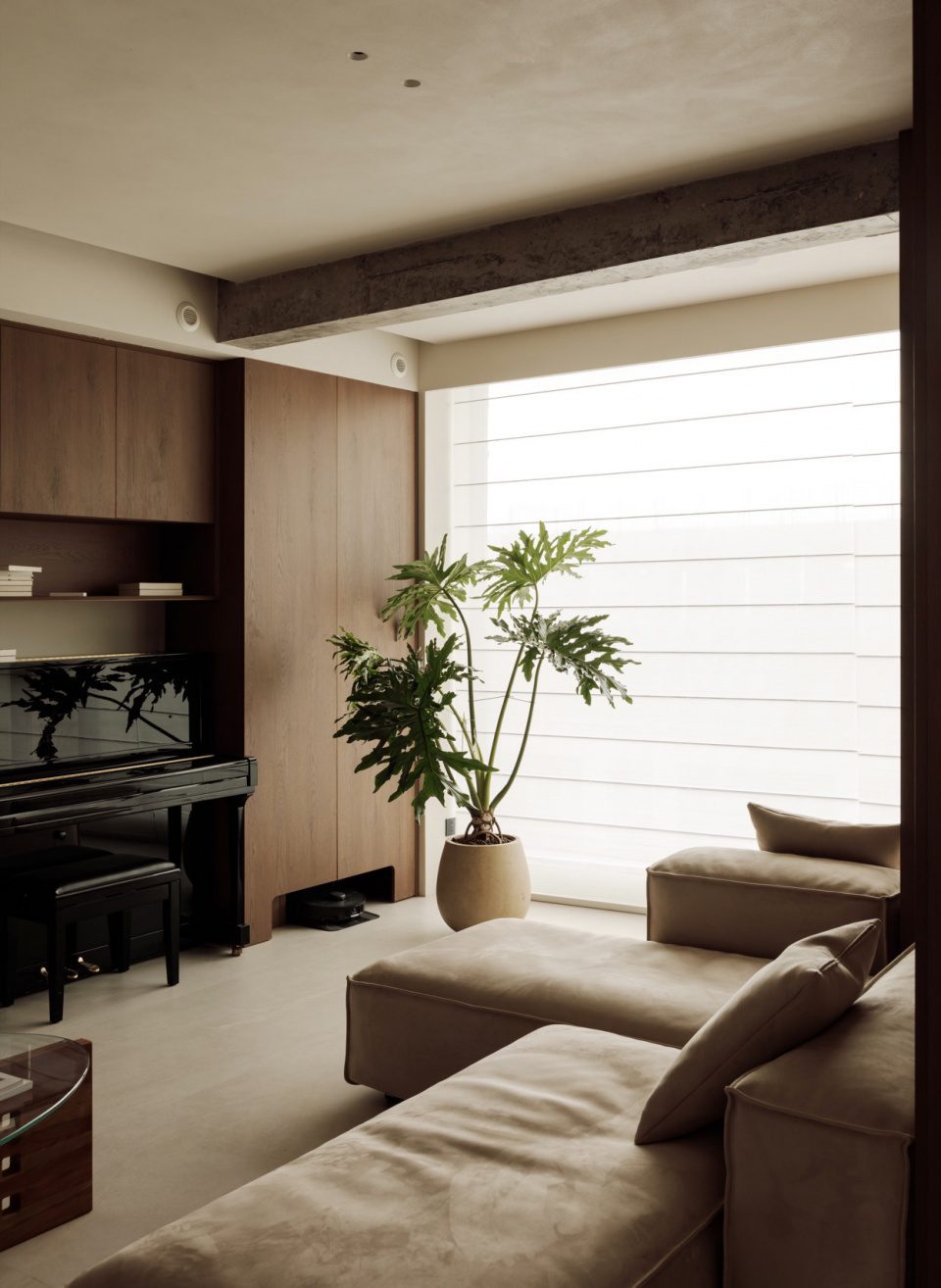 Khu vực làm việc và nghỉ ngơi đặt cạnh cửa sổ lớn. Ánh sáng tự nhiên giúp tăng sự kết nối với bên ngoài. Cây xanh được đưa vào như một điểm chạm thiên nhiên nhẹ nhàng.