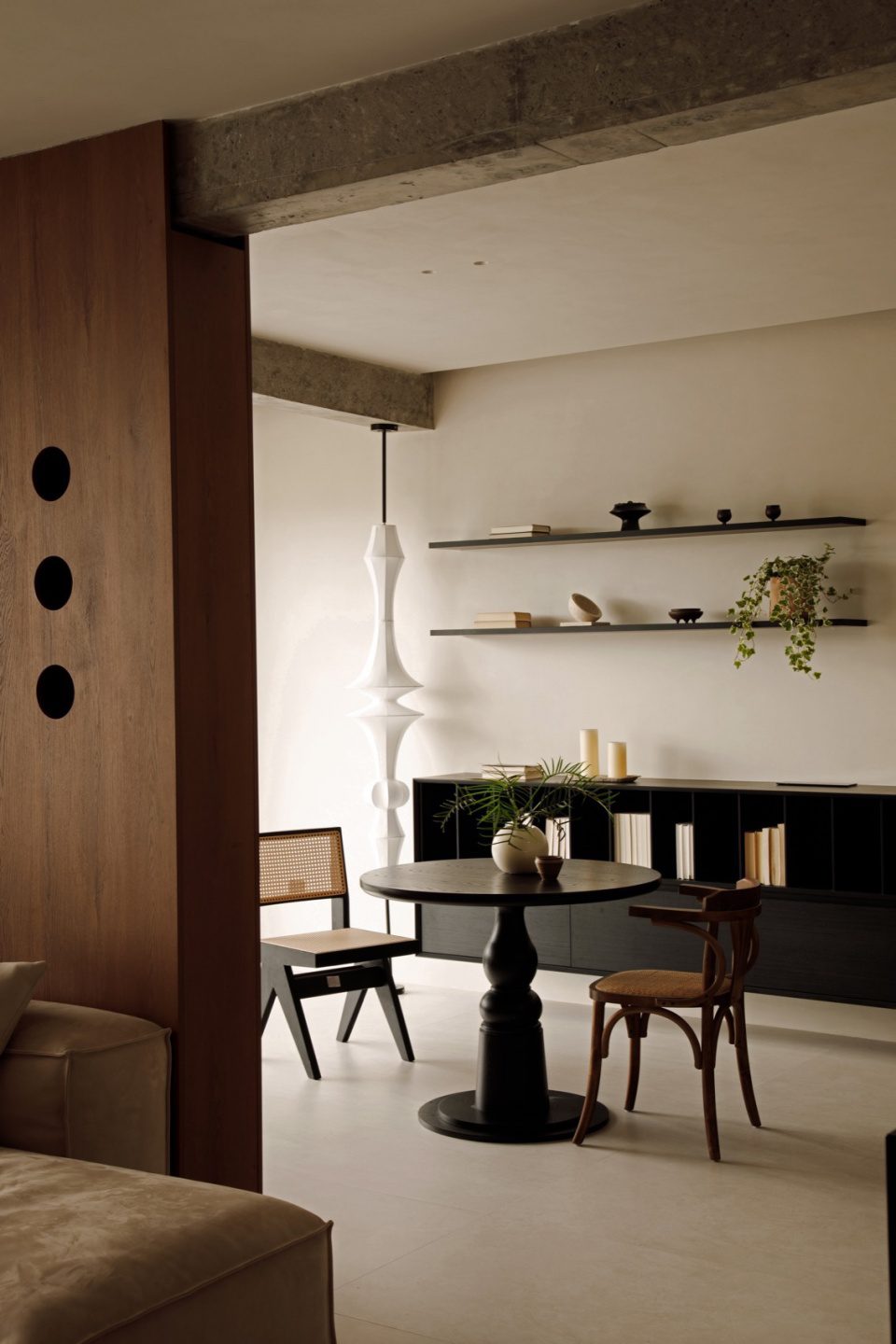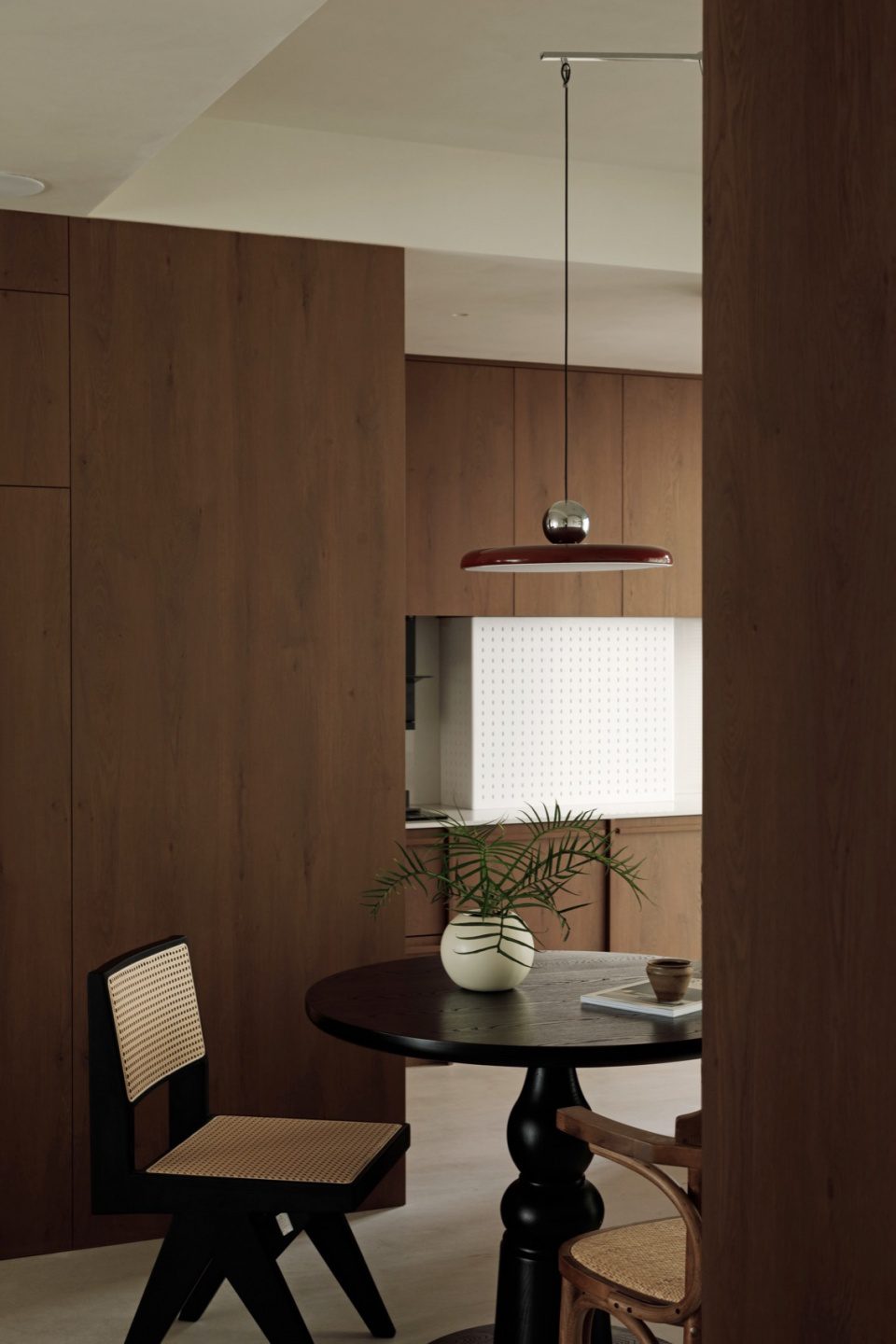 Không gian ăn uống mang sắc thái trầm lắng. Bàn tròn trung tâm tạo điểm nhấn cân bằng. Các chi tiết trang trí được tiết chế, giữ cho tổng thể luôn tinh khiết và hài hòa.
