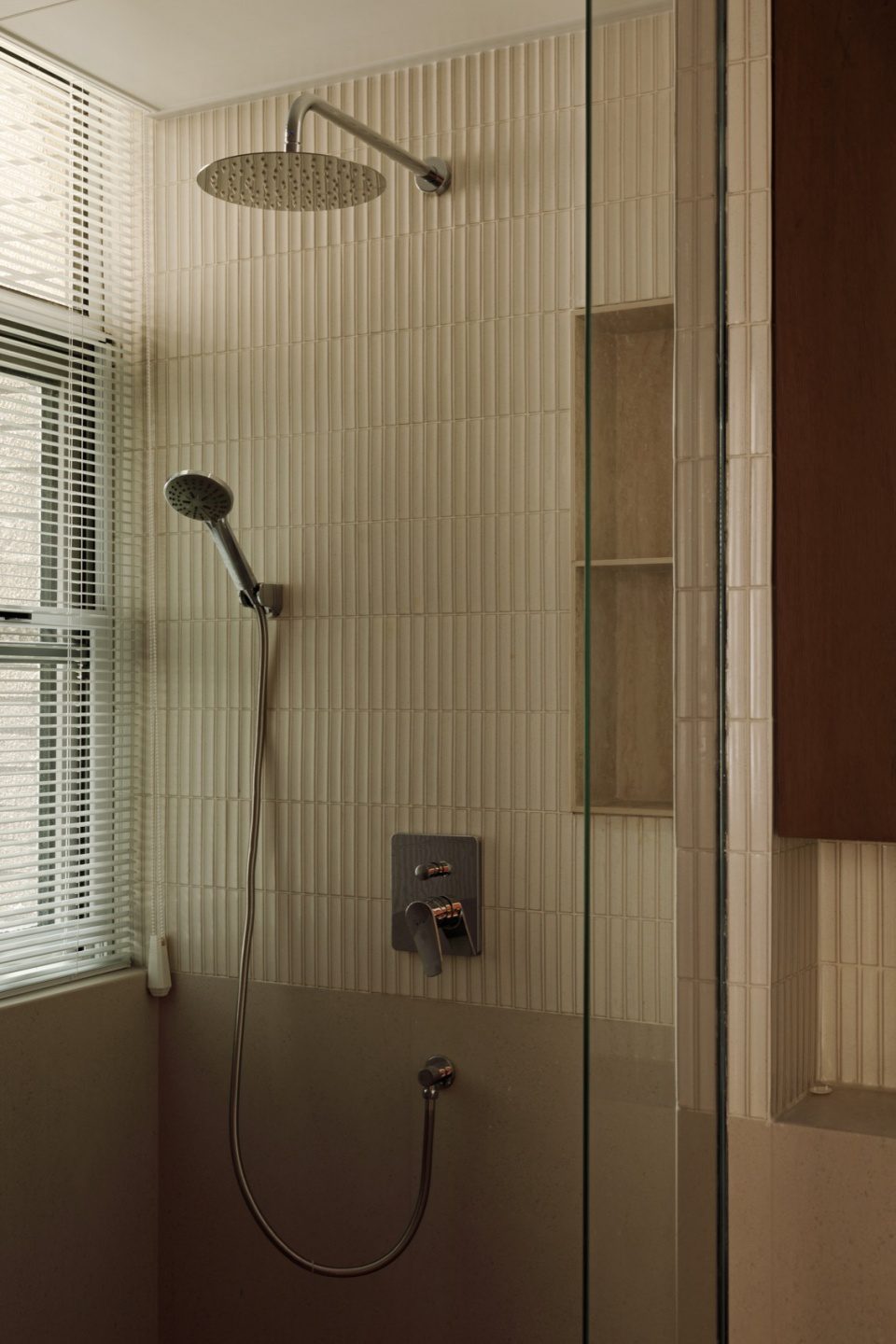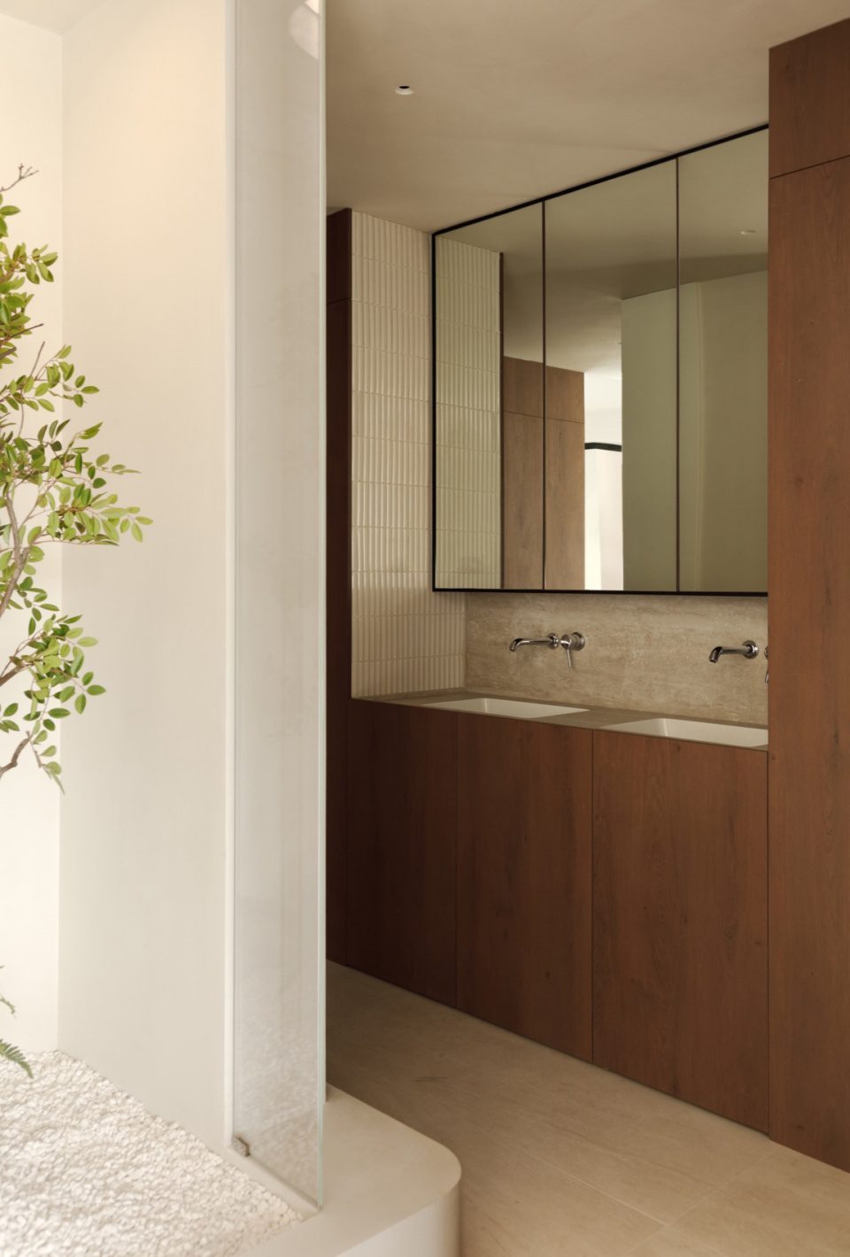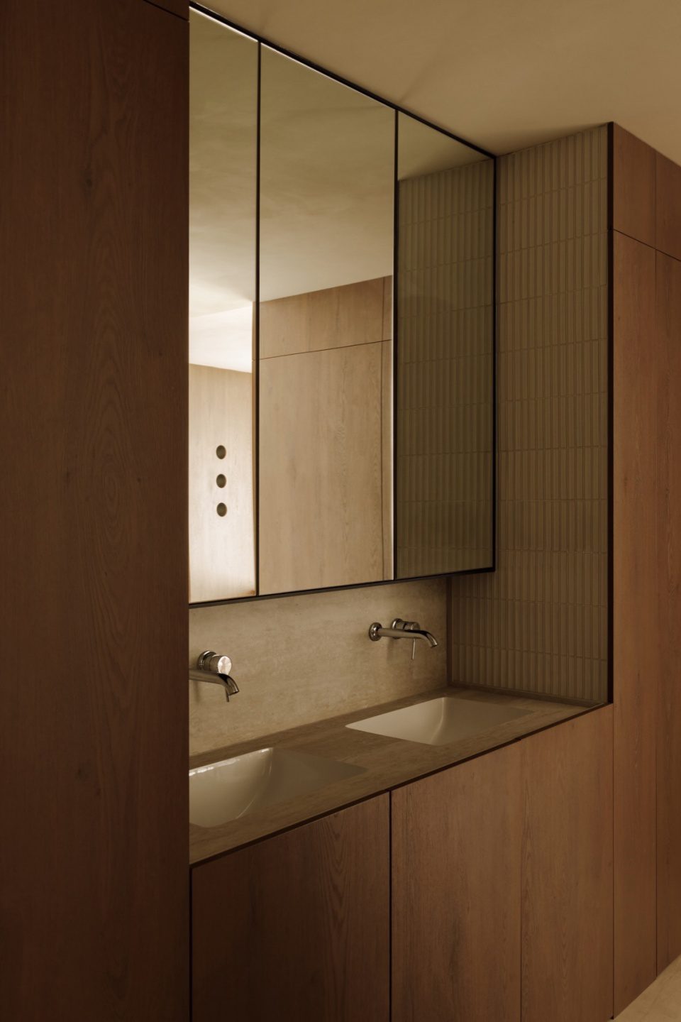 Phòng tắm tiếp tục sử dụng gỗ, đá và gạch vân dọc. Bề mặt phẳng kết hợp ánh sáng gián tiếp tạo cảm giác sạch sẽ và thư giãn.
