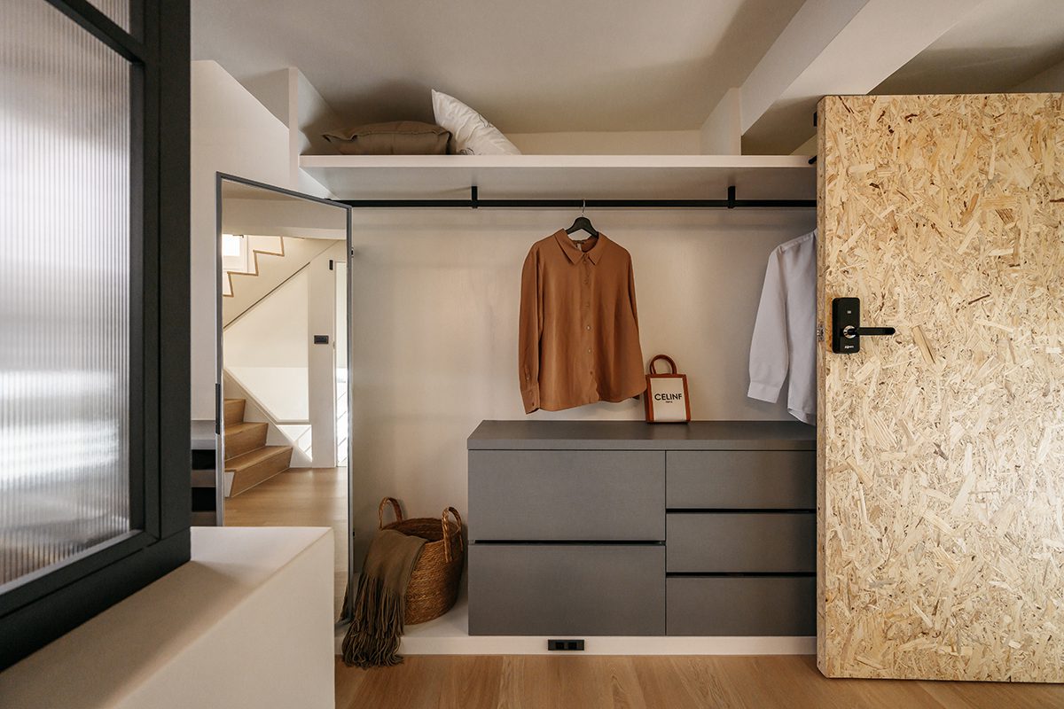 Phần gầm cầu thang được tận dụng làm khu vực lưu trữ và tủ quần áo. Giải pháp này giúp tiết kiệm diện tích và giữ cho không gian luôn gọn gàng. Hệ tủ phẳng, không tay nắm góp phần duy trì tinh thần tối giản cho tổng thể ngôi nhà.