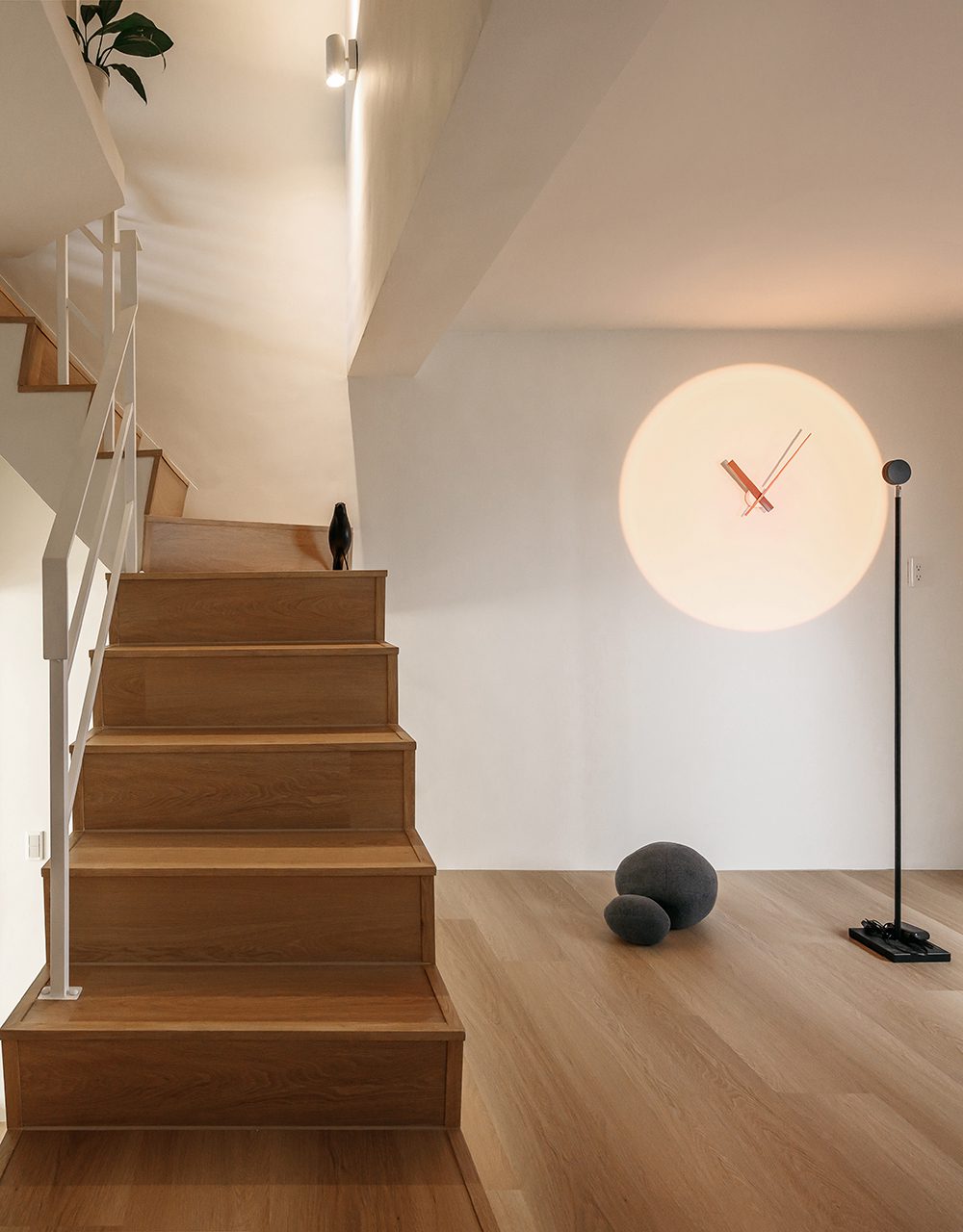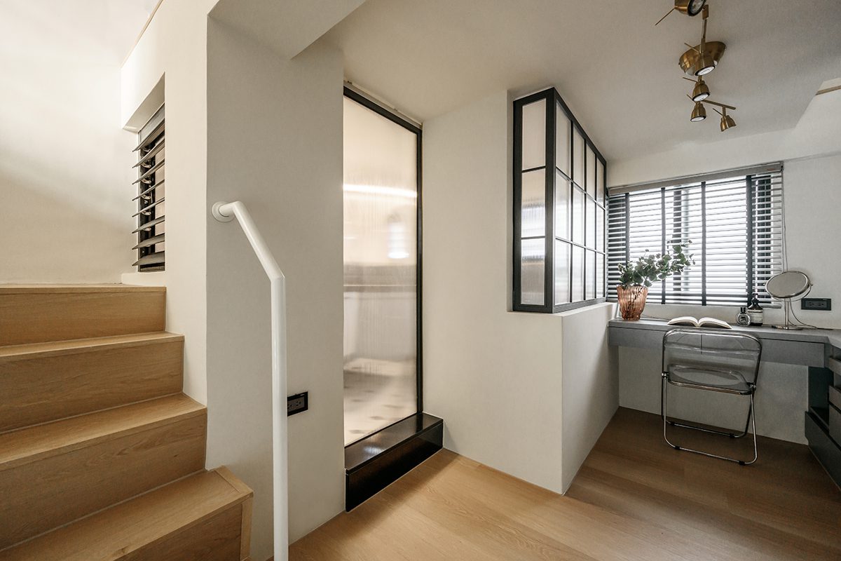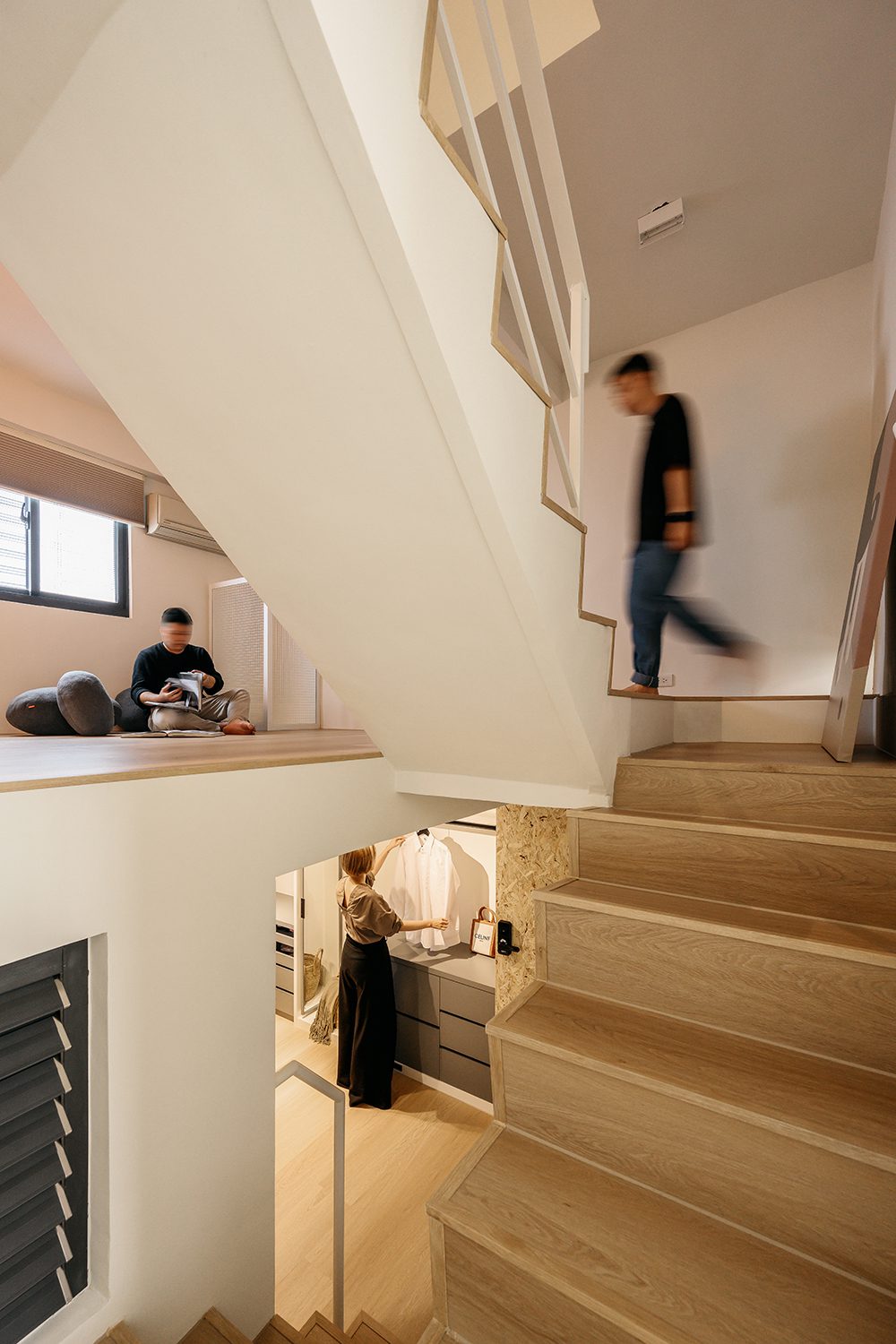 Khu vực sinh hoạt chung được thiết kế mở, kết nối trực tiếp với cầu thang và gác lửng phía trên. Cầu thang gỗ với tay vịn sơn trắng tạo cảm giác nhẹ nhàng và thanh thoát. Ánh sáng tự nhiên từ cửa sổ lớn giúp không gian luôn sáng sủa vào ban ngày.