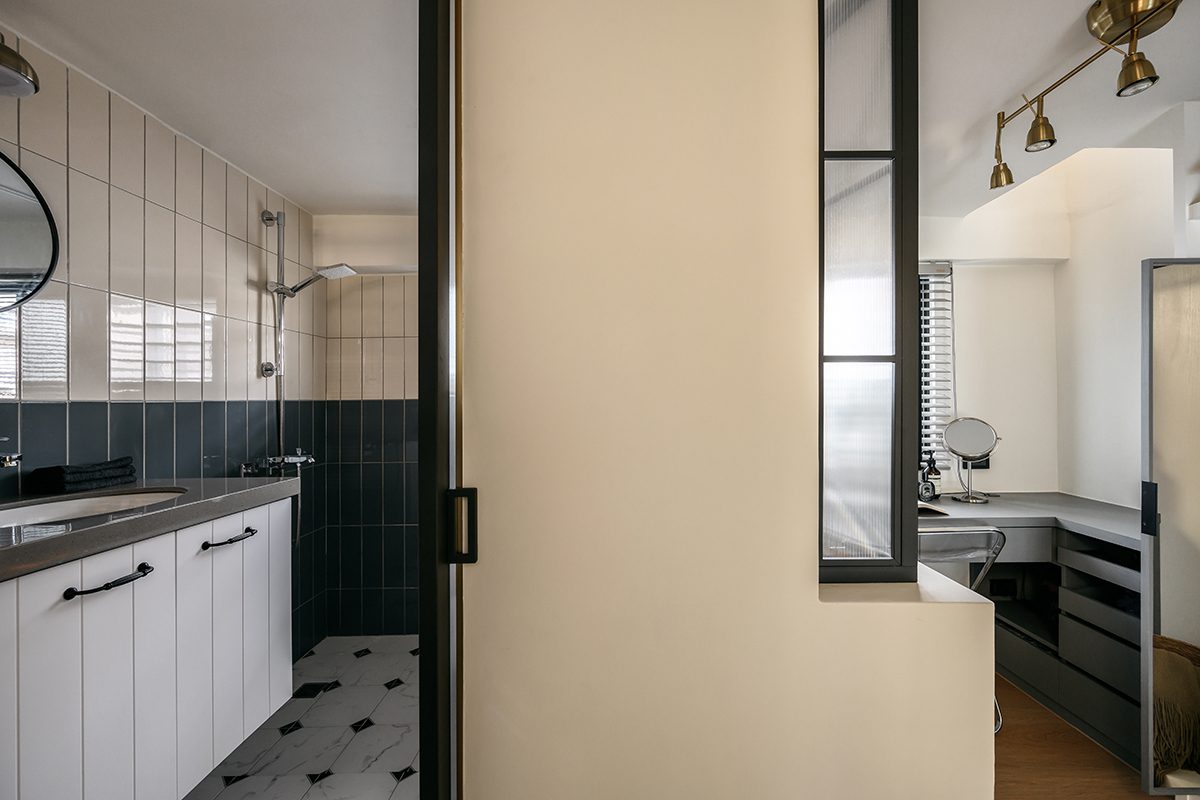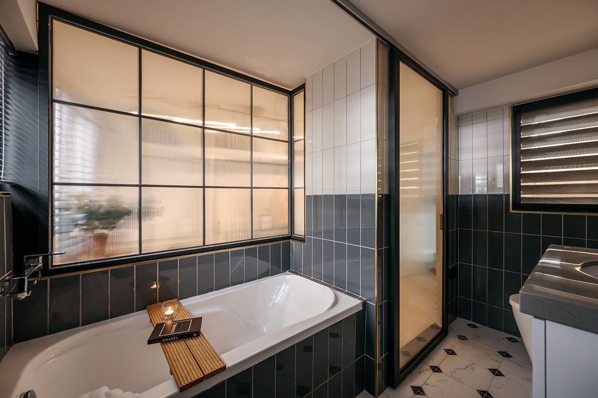 Phòng tắm được ngăn cách bằng vách kính mờ khung kim loại đen. Giải pháp này vừa đảm bảo riêng tư vừa giữ được sự thông thoáng. Gạch ốp tường màu trung tính kết hợp bồn tắm âm tạo cảm giác sạch sẽ và thư giãn.