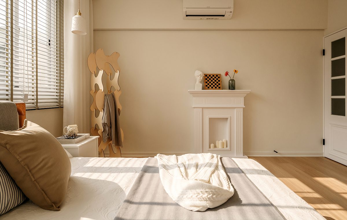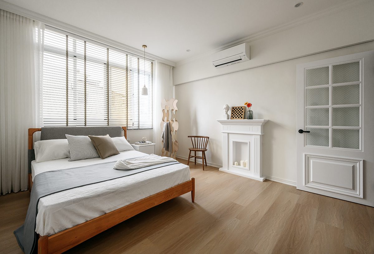 Phòng ngủ được thiết kế đơn giản với giường gỗ, ga trải giường màu trung tính và ánh sáng tự nhiên dồi dào. Cửa sổ lớn kết hợp rèm mỏng giúp điều chỉnh ánh sáng linh hoạt. Không gian vì thế luôn sáng và thoáng.